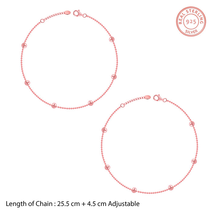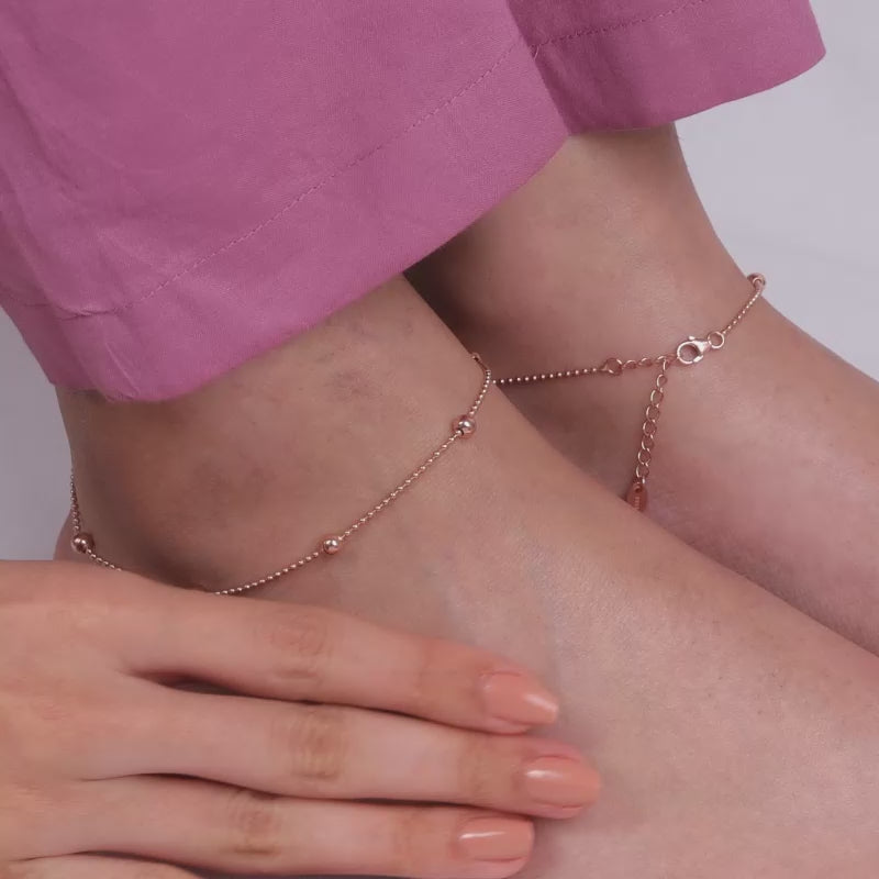 This rose gold plated anklet for women features evenly spaced spherical beads along the chain.