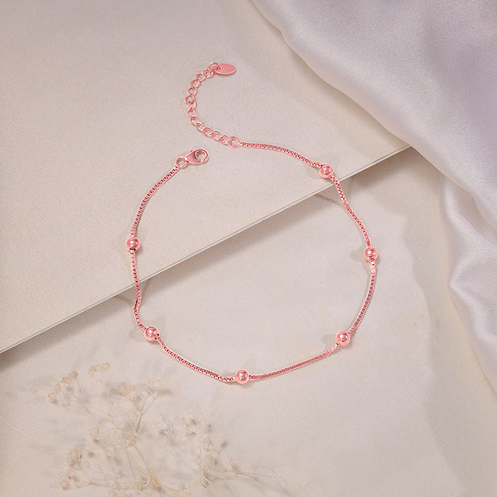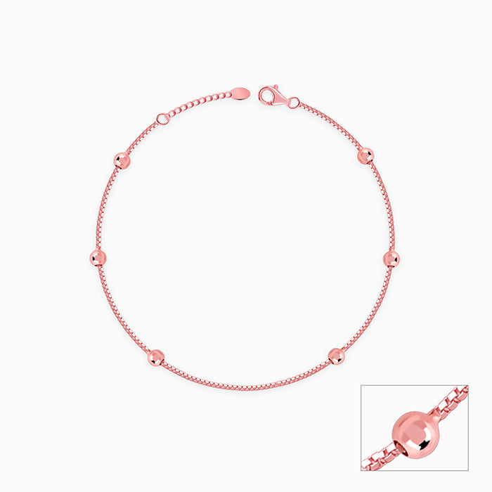 This rose gold plated anklet for women features evenly spaced spherical beads along a box chain.