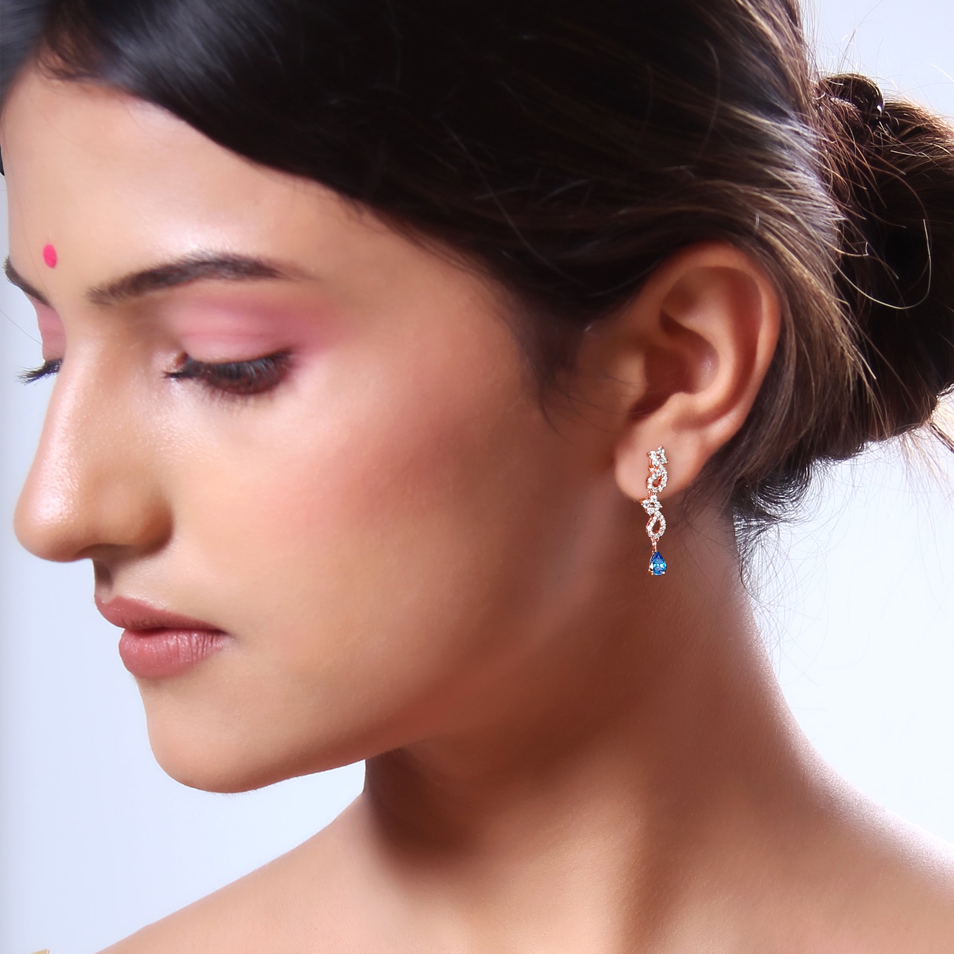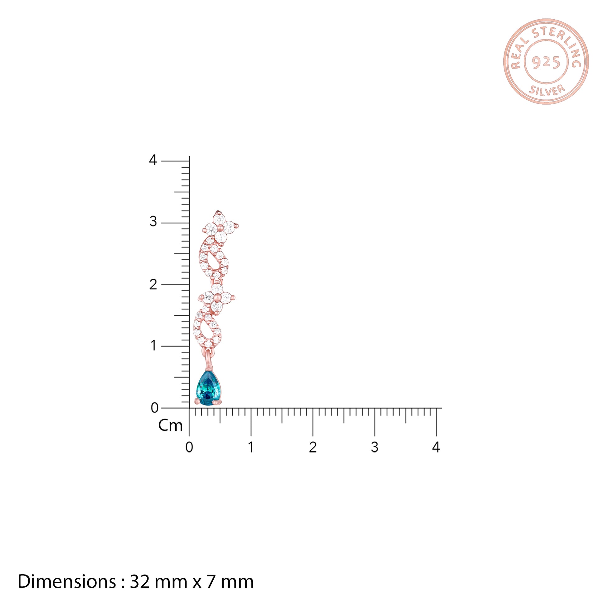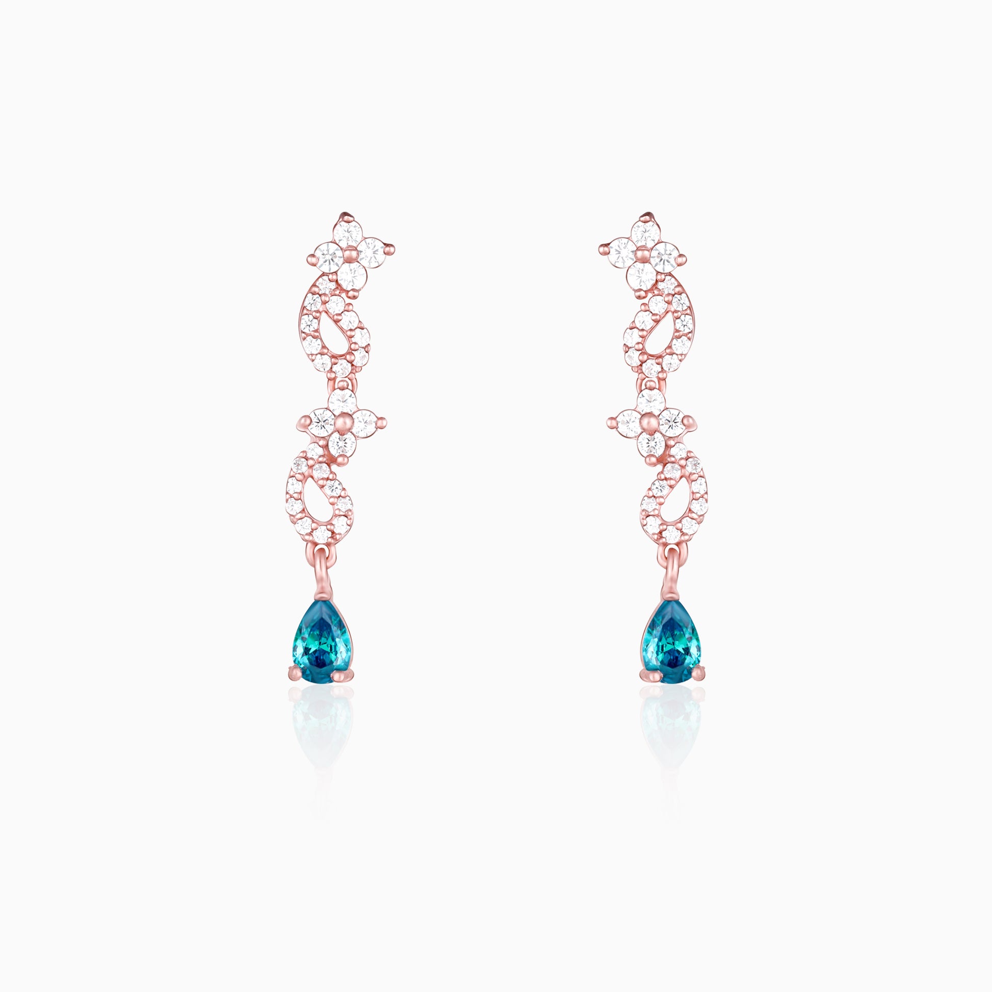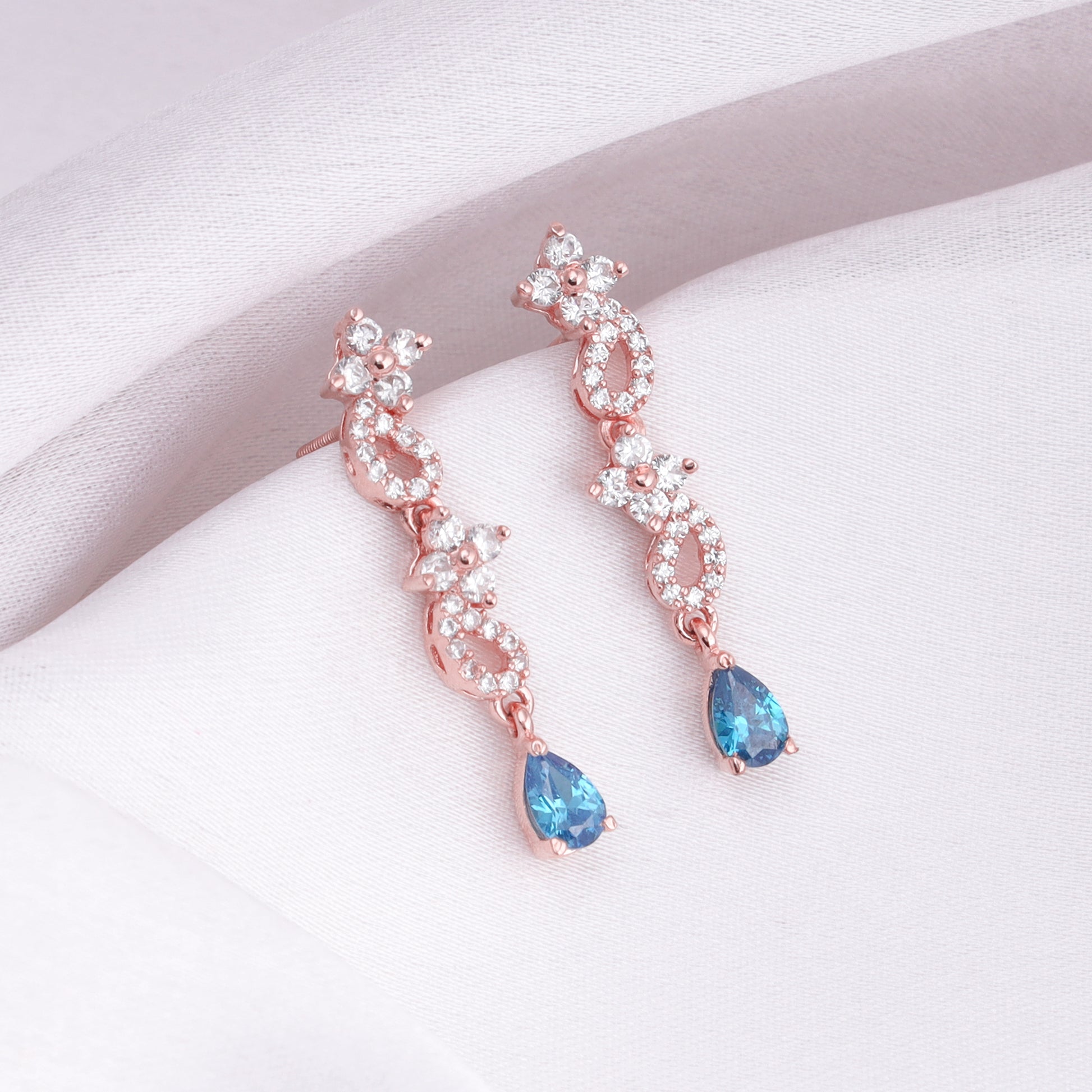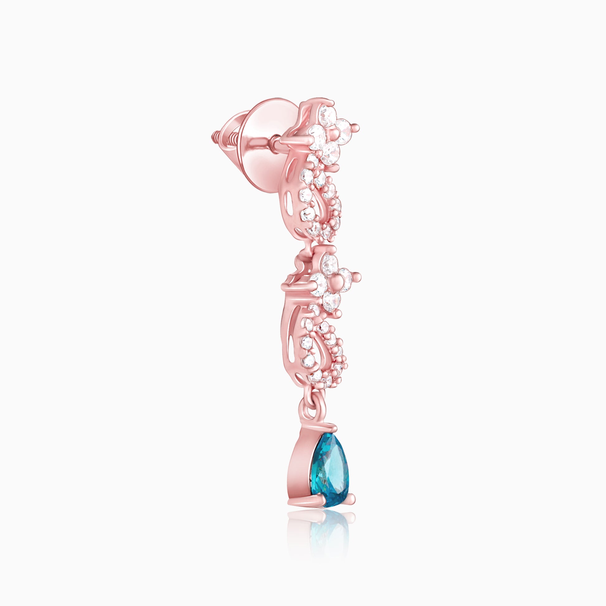 The Rose Gold Blue Moon Earrings have an elegant design of a necklace with studded zircons, crystal blue coloured stone at the centre, and a rose-gold plating finish.