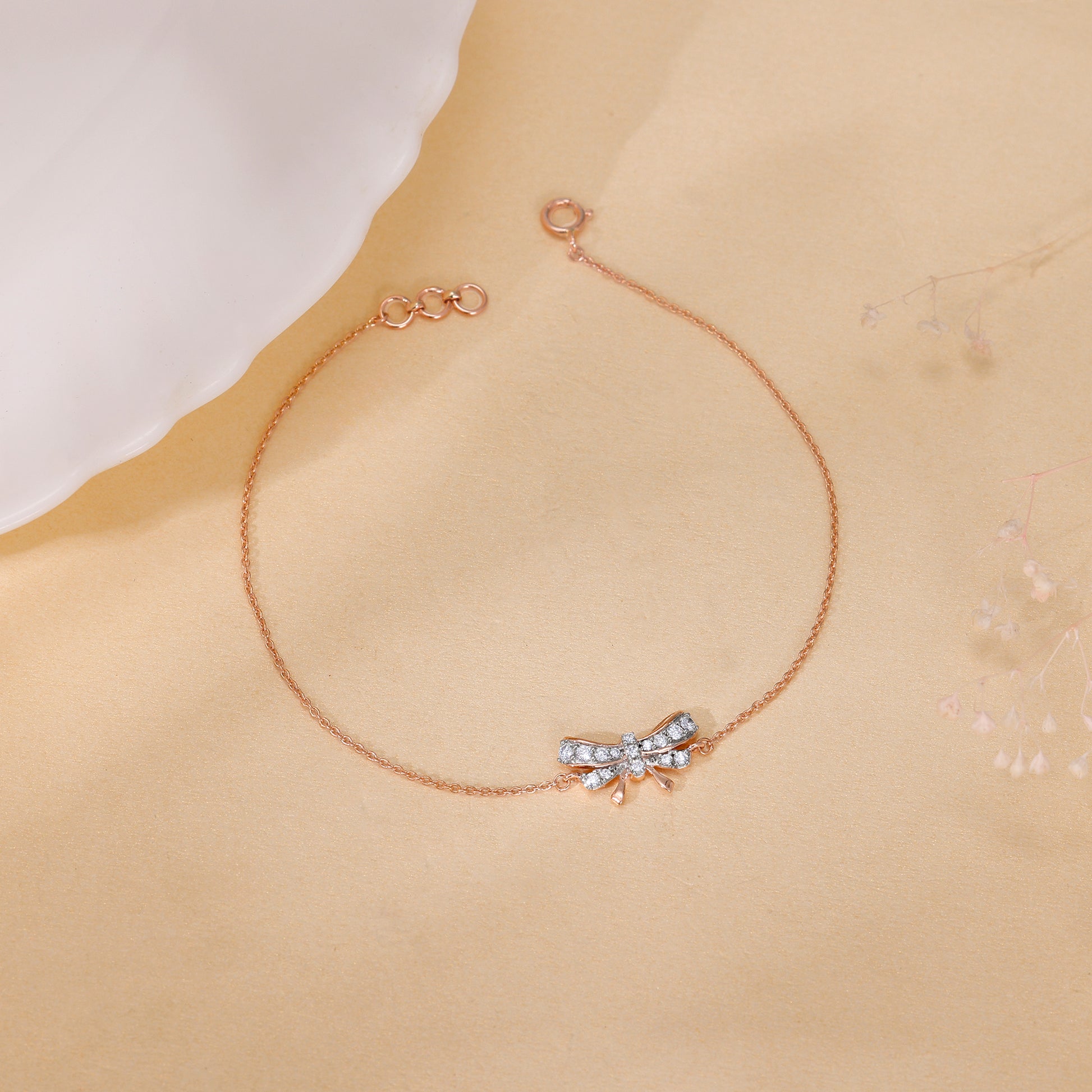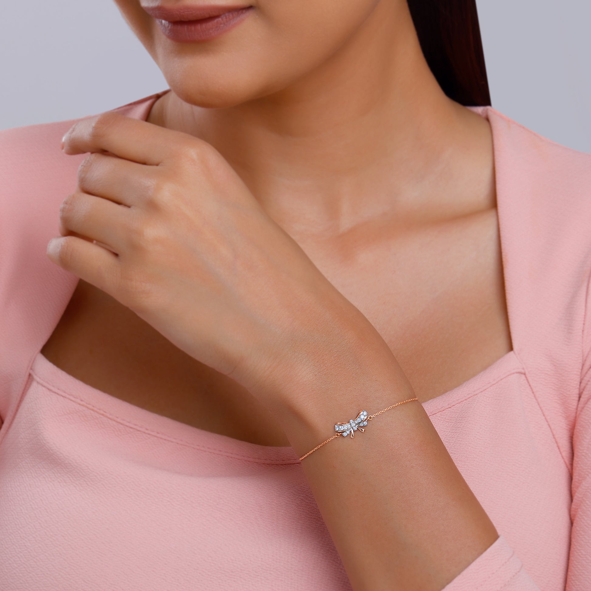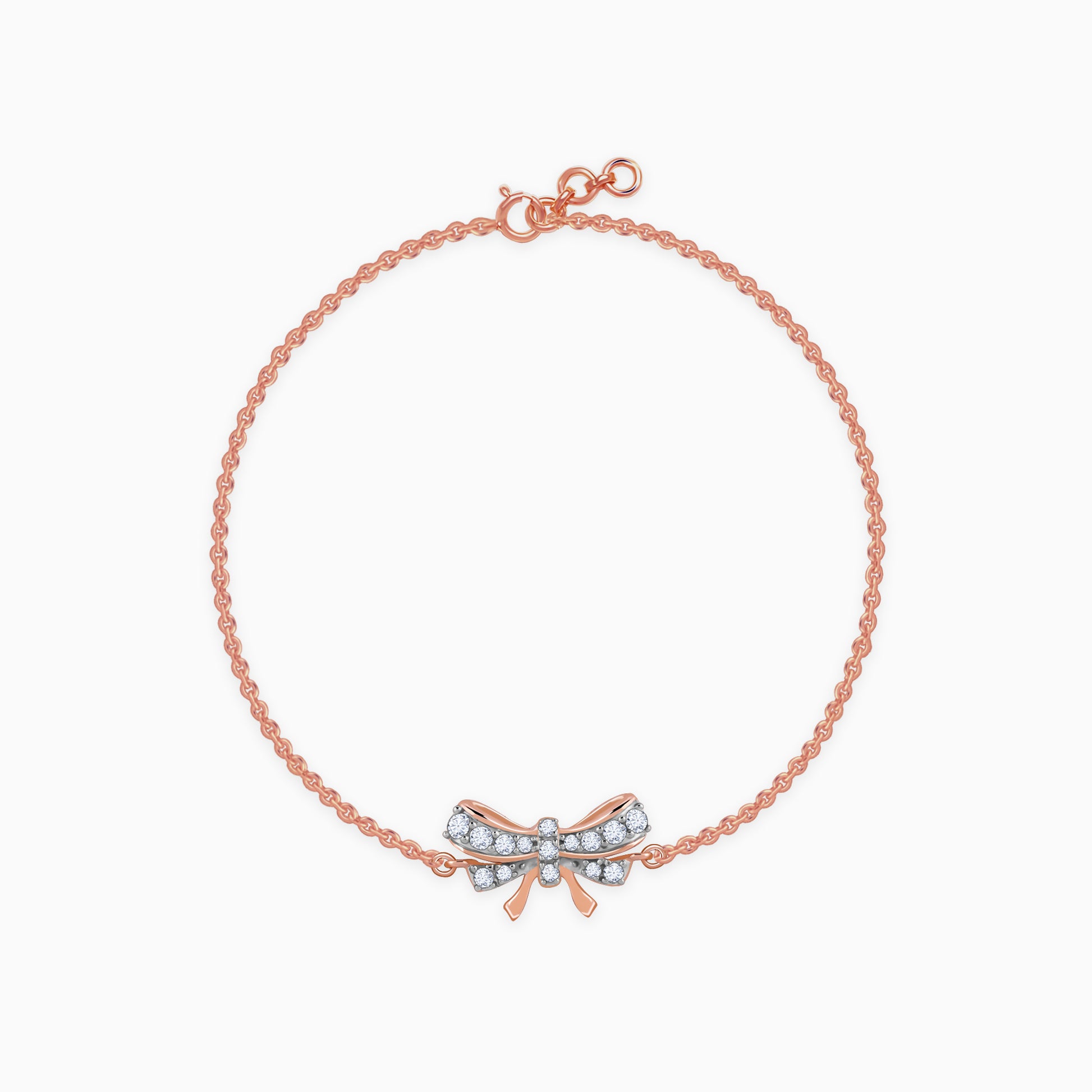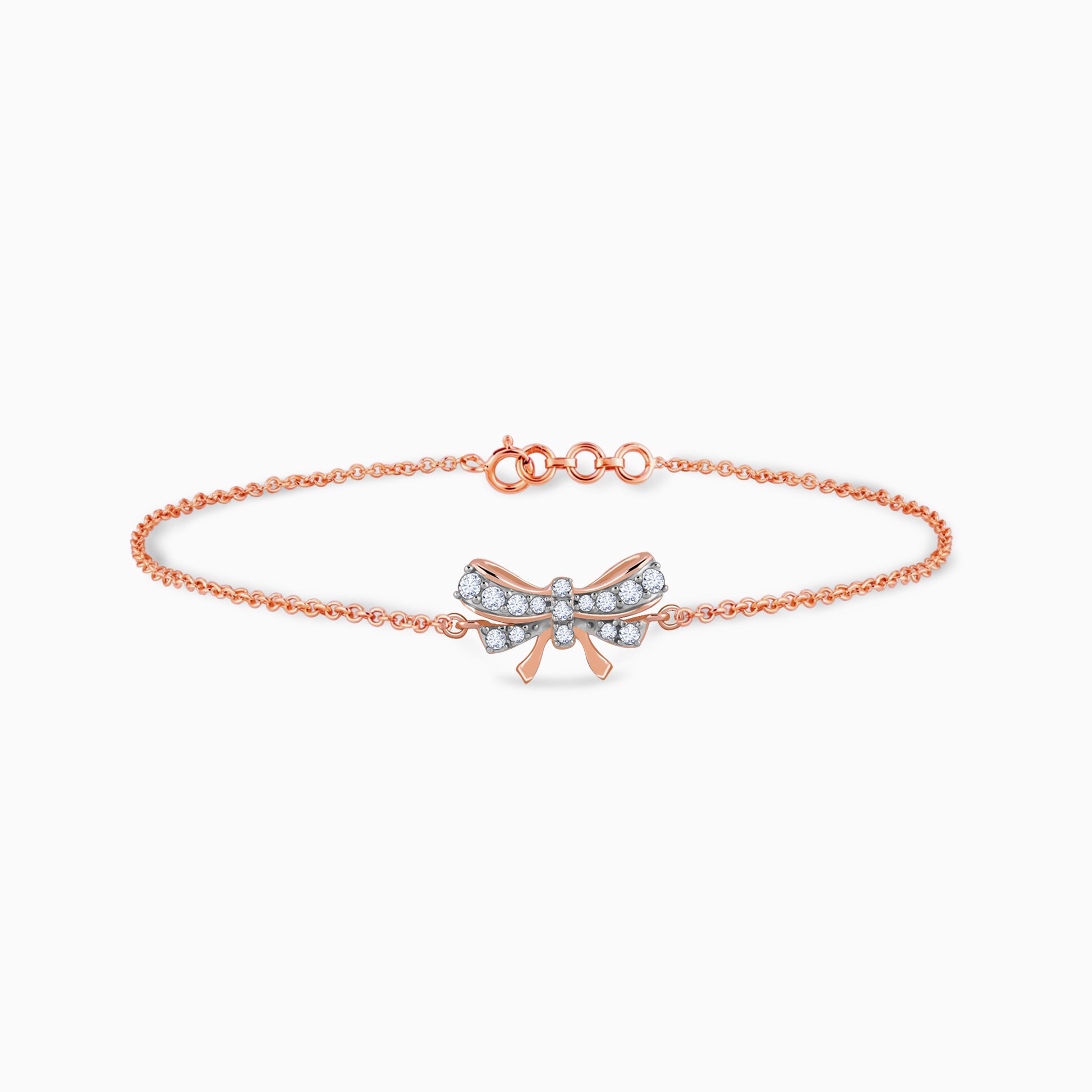 This pure rose gold bracelet for women features a bow motif studded with lab grown diamonds.