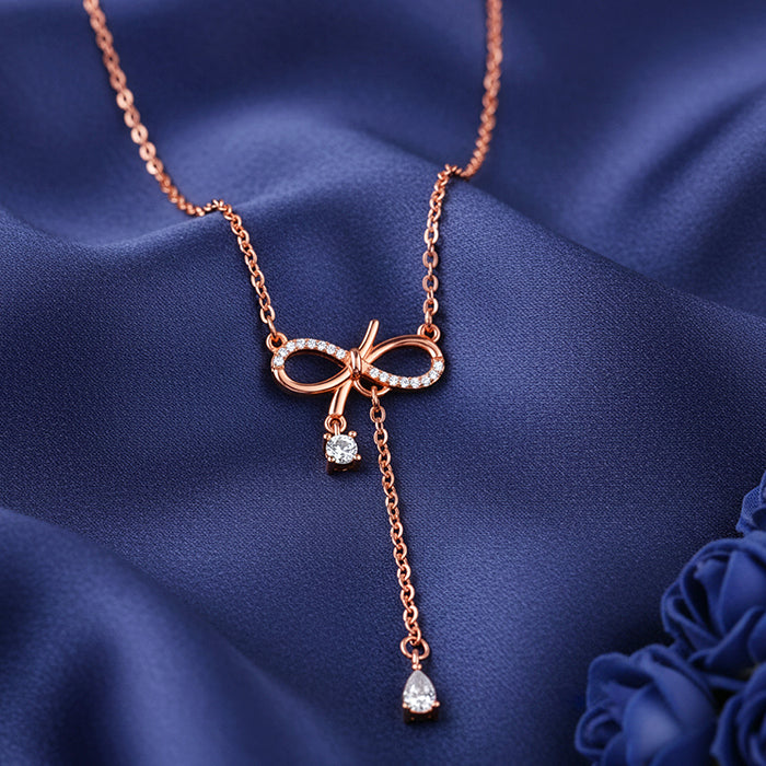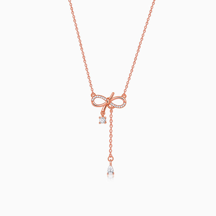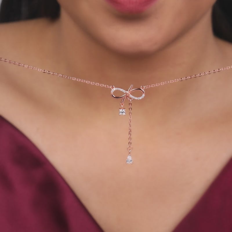 A whimsical piece designed to add a touch of magic to everyday. This elegant rose gold plated necklace features a graceful bow design accented with pavé crystals and shimmering teardrop and solitaire droplets.