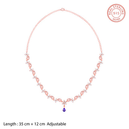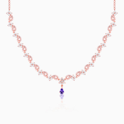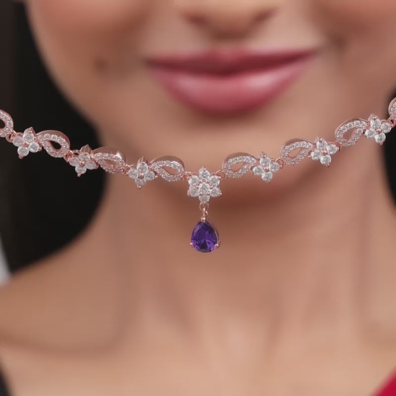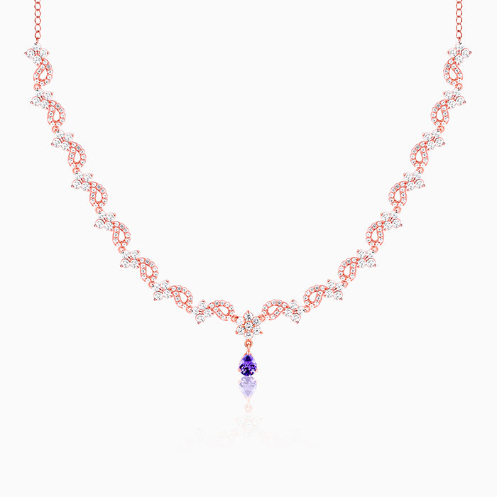 The rose gold necklace showcases a flower motif set with zircons with a dangling pearl, and it alternates with mango motifs that are connected to the flower motifs.