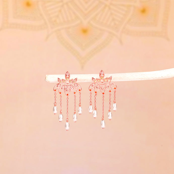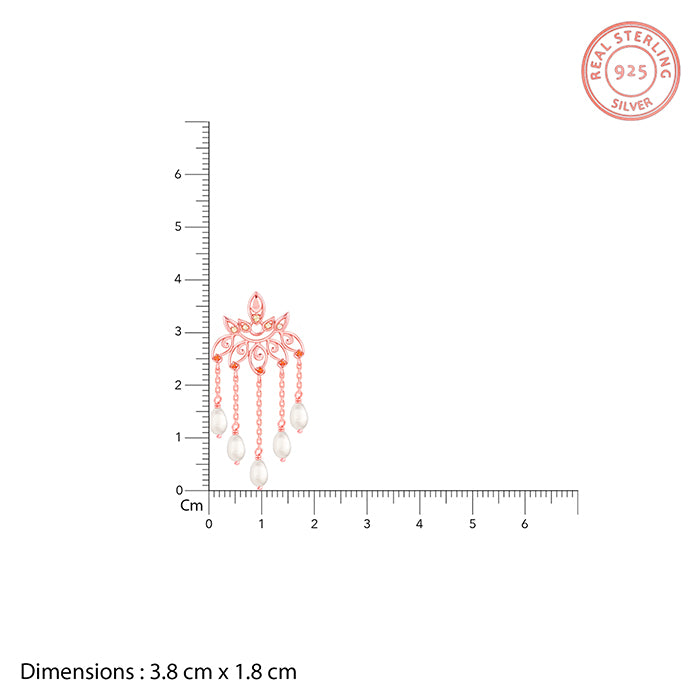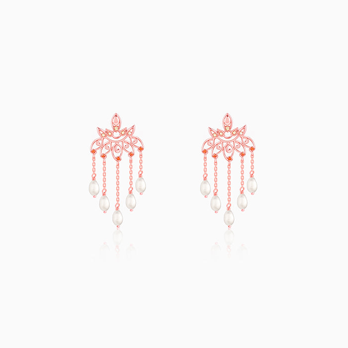 These rose gold earrings for women feature an intricate floral design embellished with coloured stones, from which chains dangle with lustrous pearl drops.