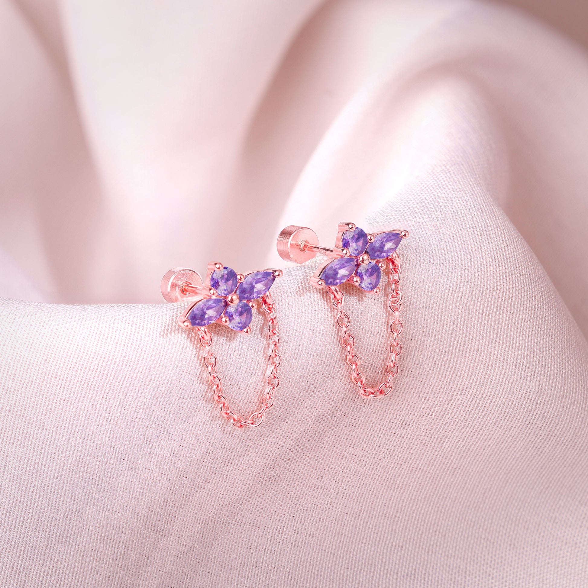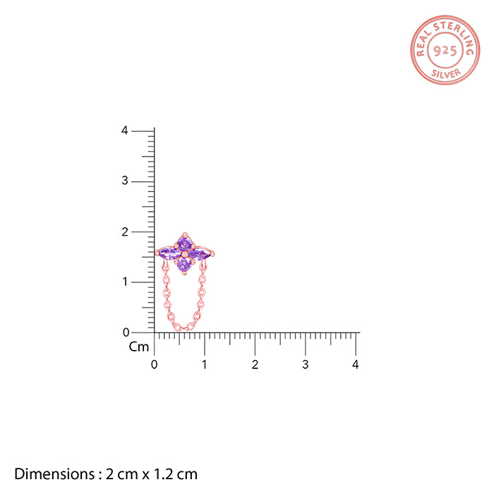 These rose gold plated ear piercings for girls feature a stylised floral motif studded with amethyst zircons. A chain link dangles from one petal to another. Got multiple piercings? Get ready to curate your unique ear story! Mix, match, and express your personal style with our latest collection.