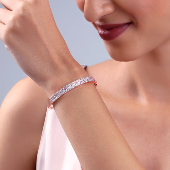 This rose gold plated bracelet for women features a luxurious triple-row setting. It is embellished with sparkling cubic zircon stones.
