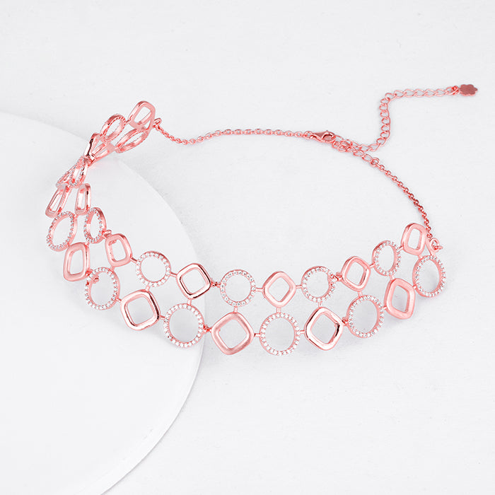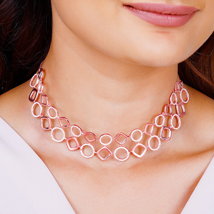 This rose gold necklace has a small circle and square-shaped motifs studded with zircons alternatively in a two-tier layout.