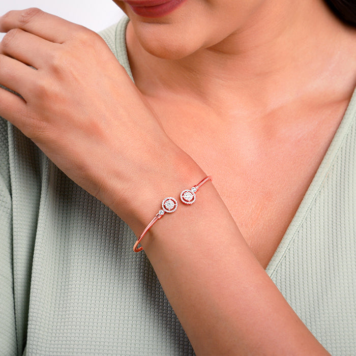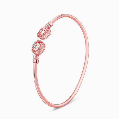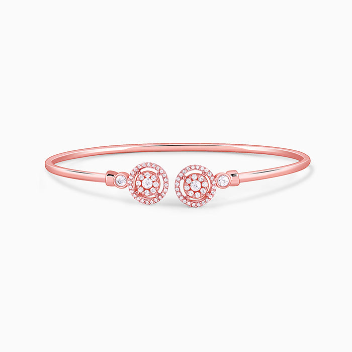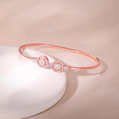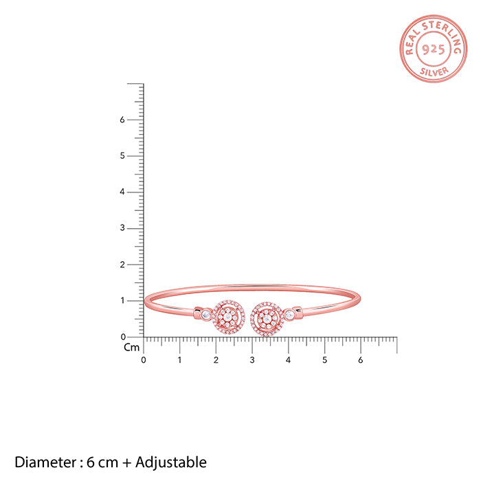 This rose gold plated cuff bracelet for women features an adjustable design with a single, round stone set on each side, connected to a halo design studded with zircons.
