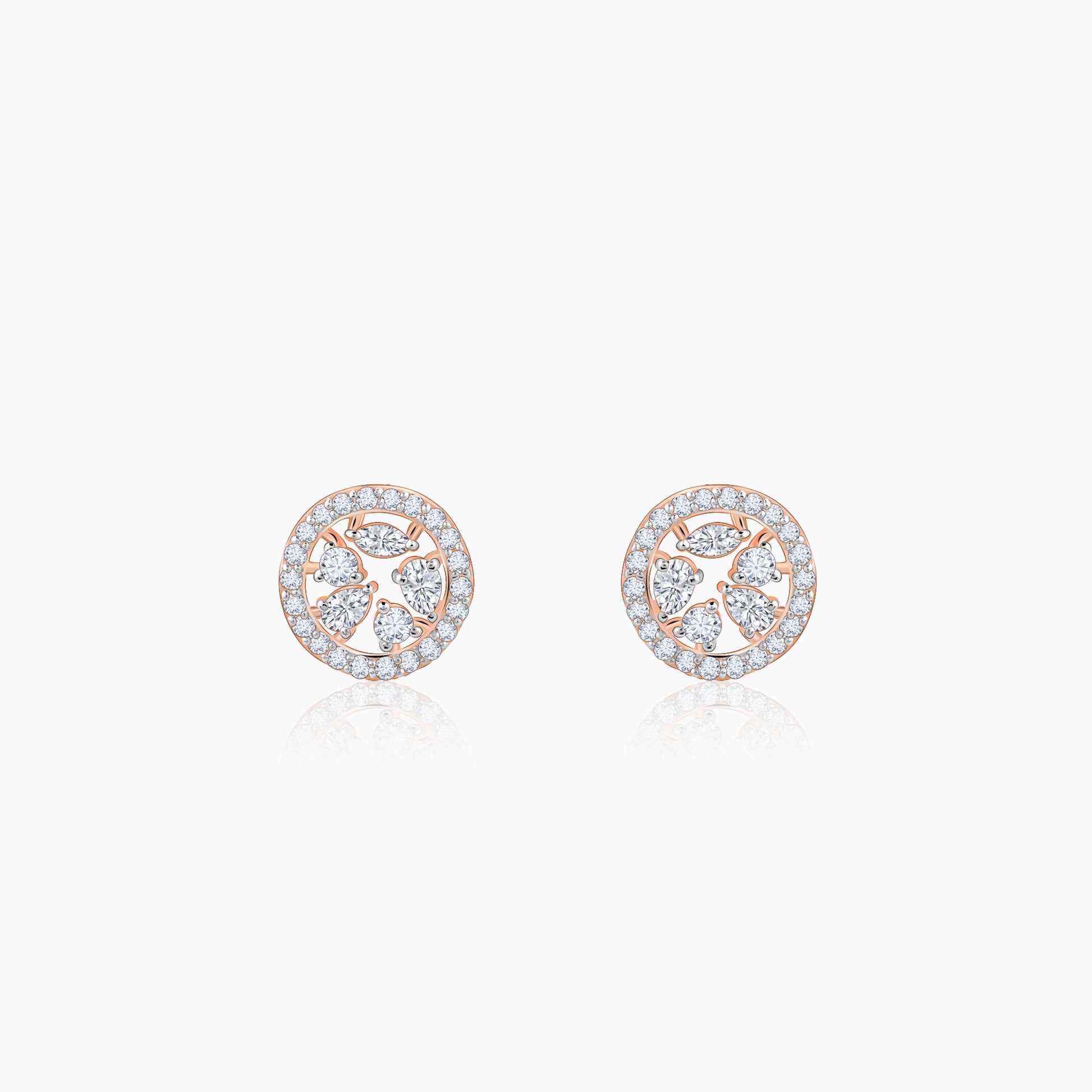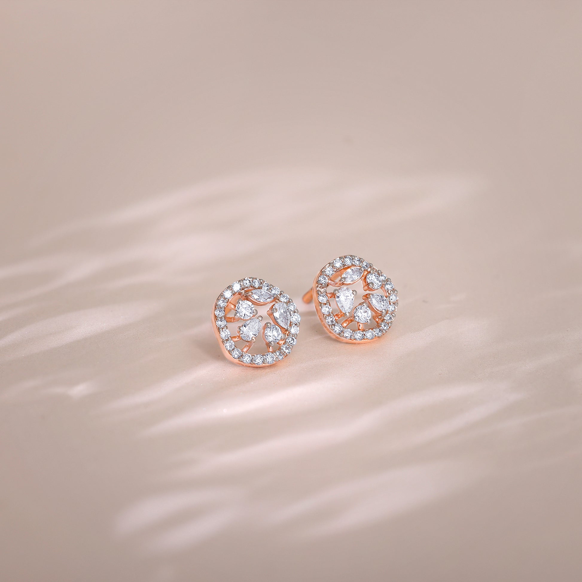 These pure rose gold earrings feature a circle motif with intricate designs studded with lab-grown diamonds.