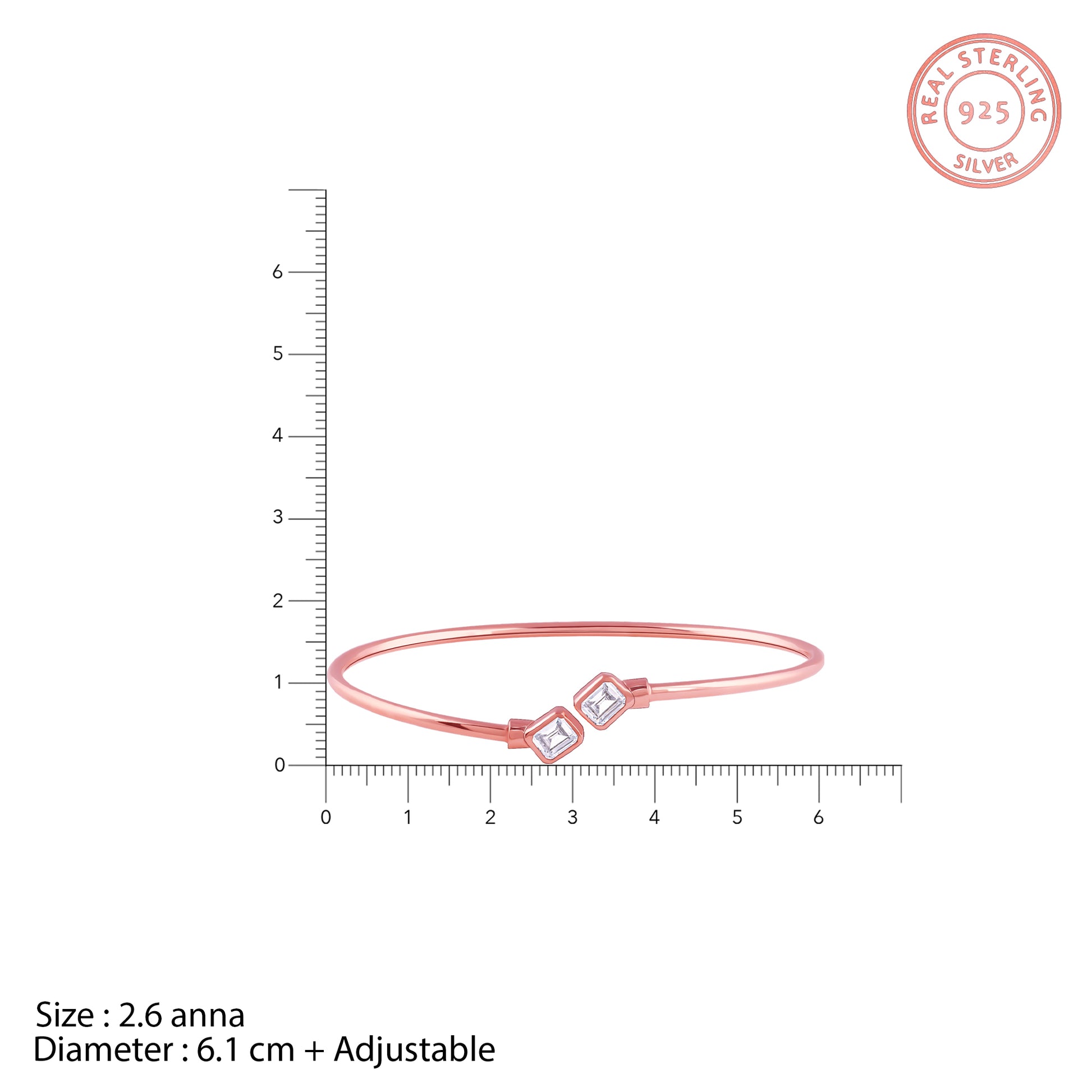 This rose gold plated bracelet for women features an open design, accented with two square-cut zircons set in sleek bezel settings on both ends.