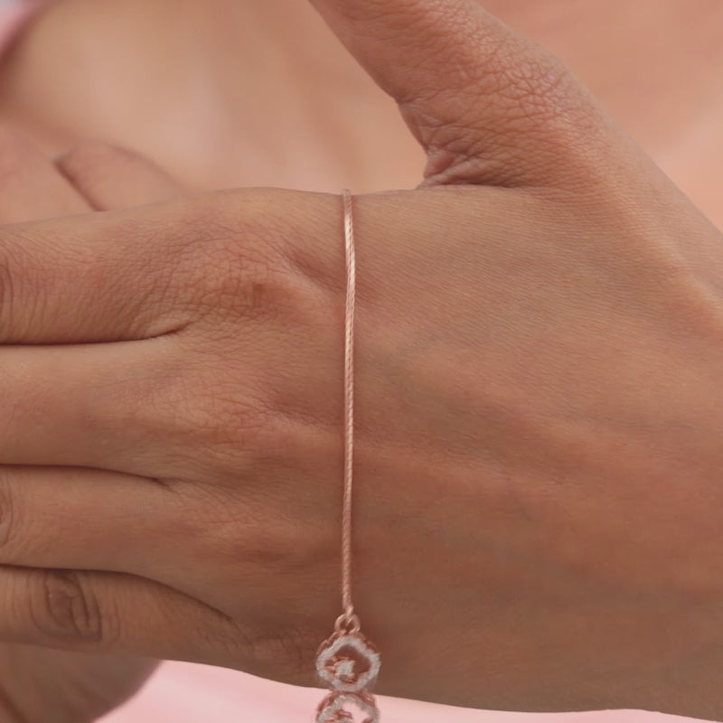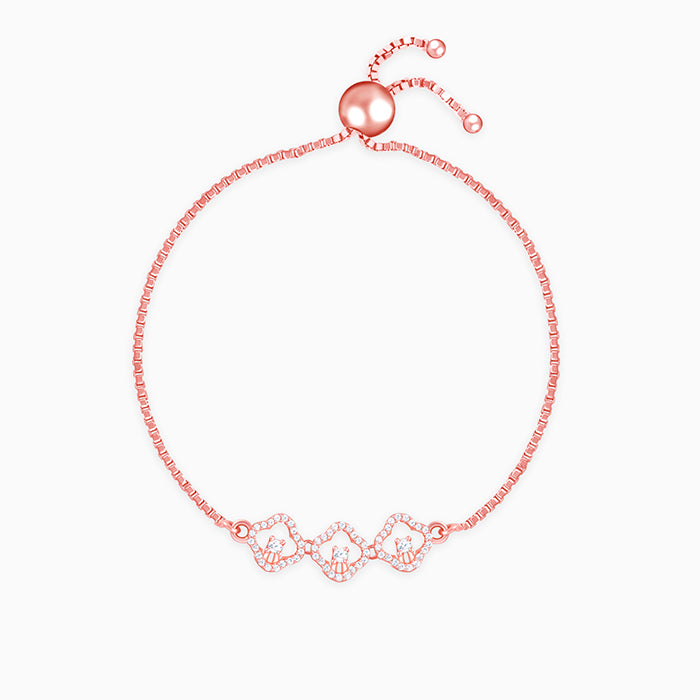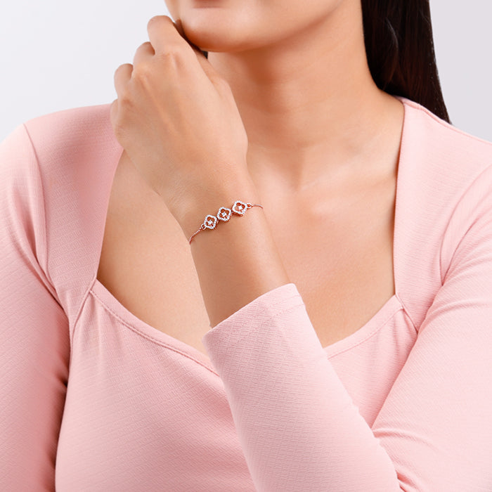 This rose gold plated bracelet for women features three zircon-studded quatrefoil frames. Each frame has a zircon set at the centre.