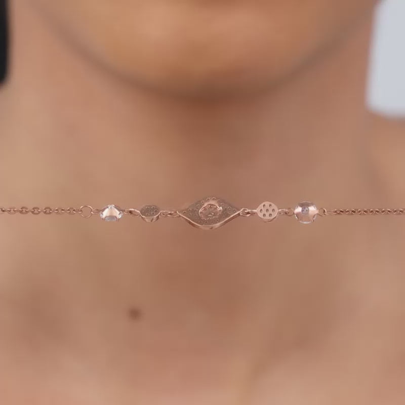This rose gold bracelet features an eye design at the centre, flanked by two circular motifs with sparkling zircons.