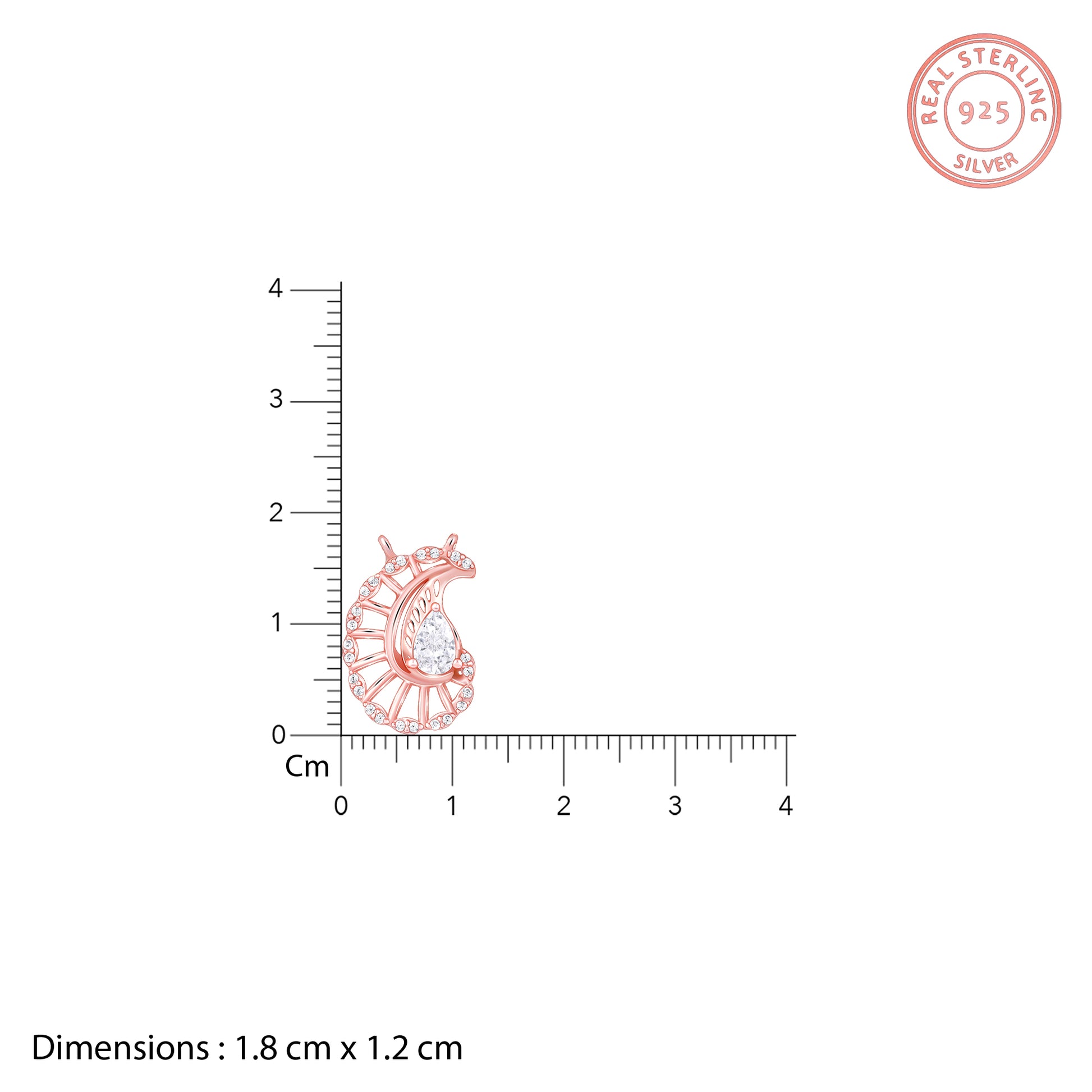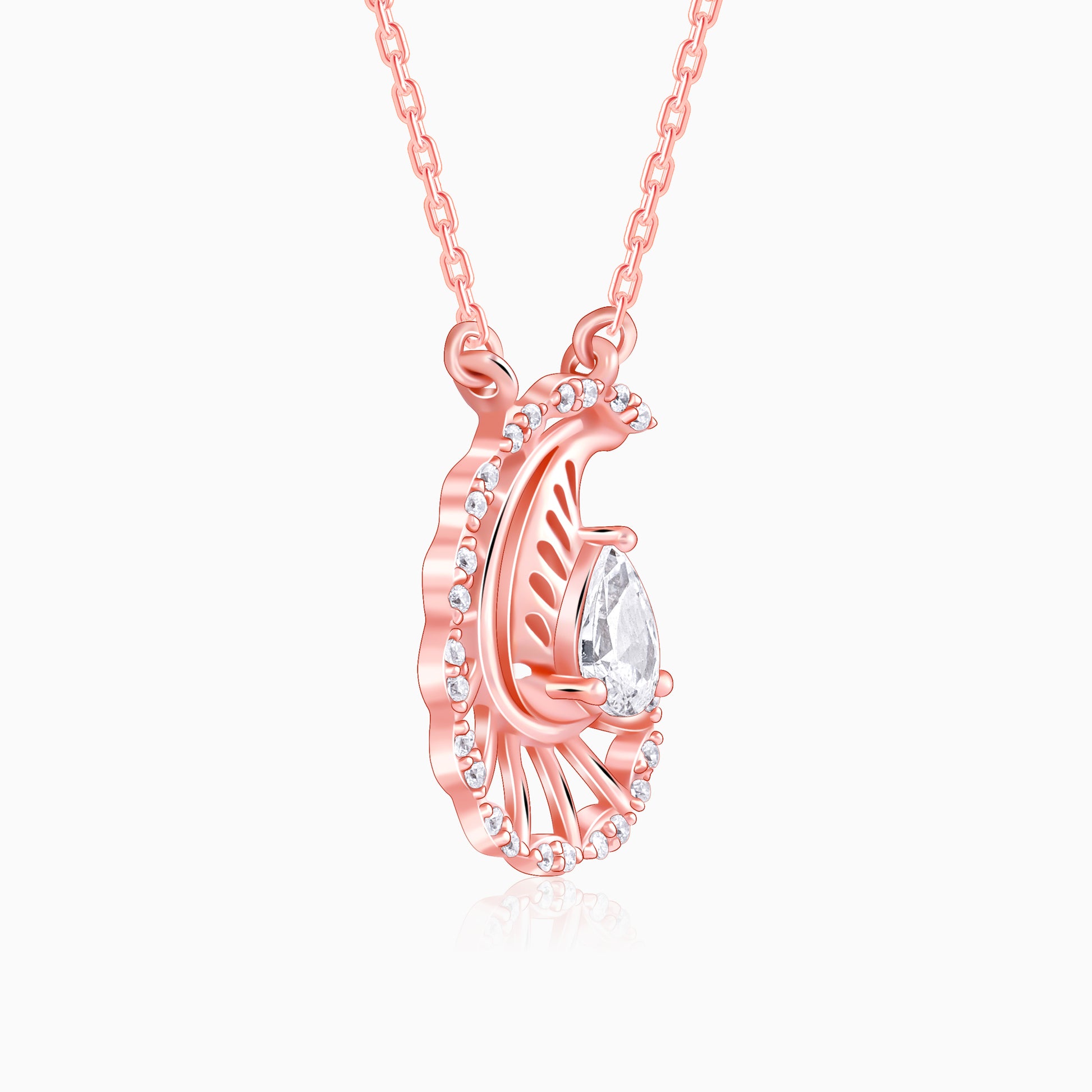 This rose gold pendant for women showcases a unique paisley design, highlighted by a large teardrop-shaped zircon at the centre, encircled by a halo of smaller round stones.