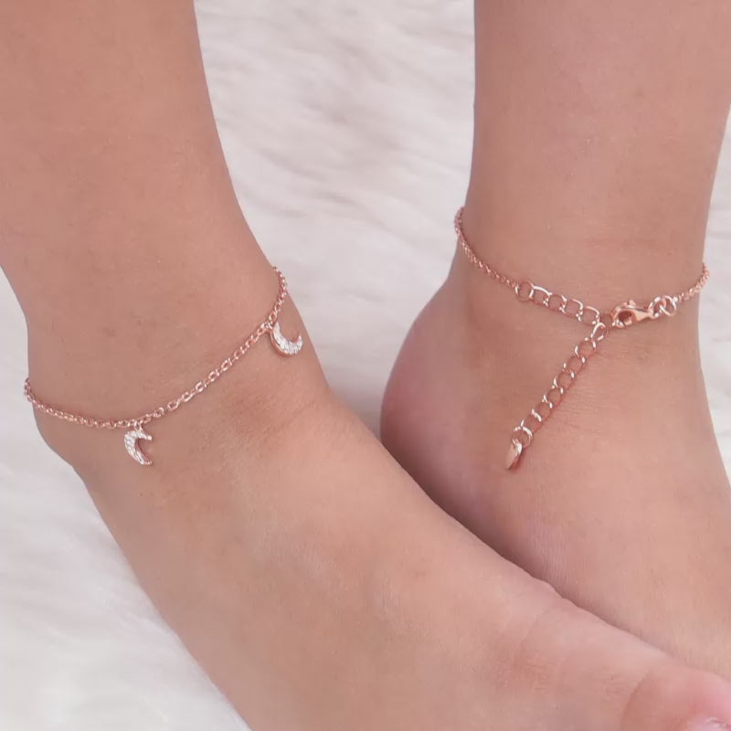 This rose gold plated anklet for kids features a dangling two crescent motif studded with zircons.