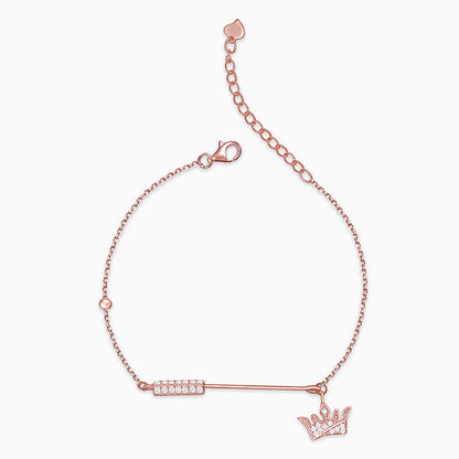 This rose gold bracelet for women features a horizontal bar element set with zircons, extending to a dangling crown charm also set with sparkling zircons. A small, round rose gold bead accentuates the chain.