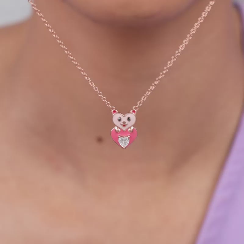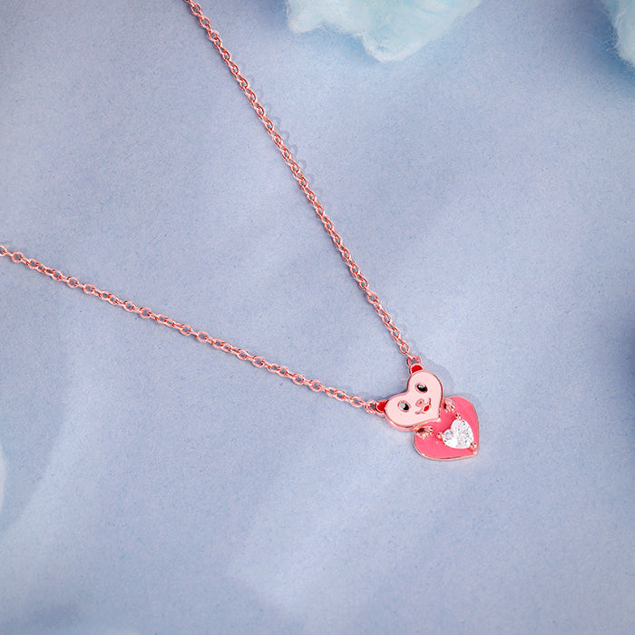 This rose gold plated necklace for kids features the GIVA mascot in enamel, holding a heart motif also coated in enamel, with a sparkling heart-shaped zircon set at the centre.
