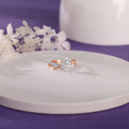 This pure rose gold ring features a floral motif connected to a wave, both studded with lab-grown diamonds.