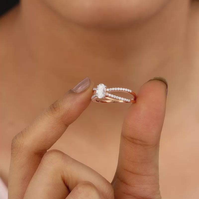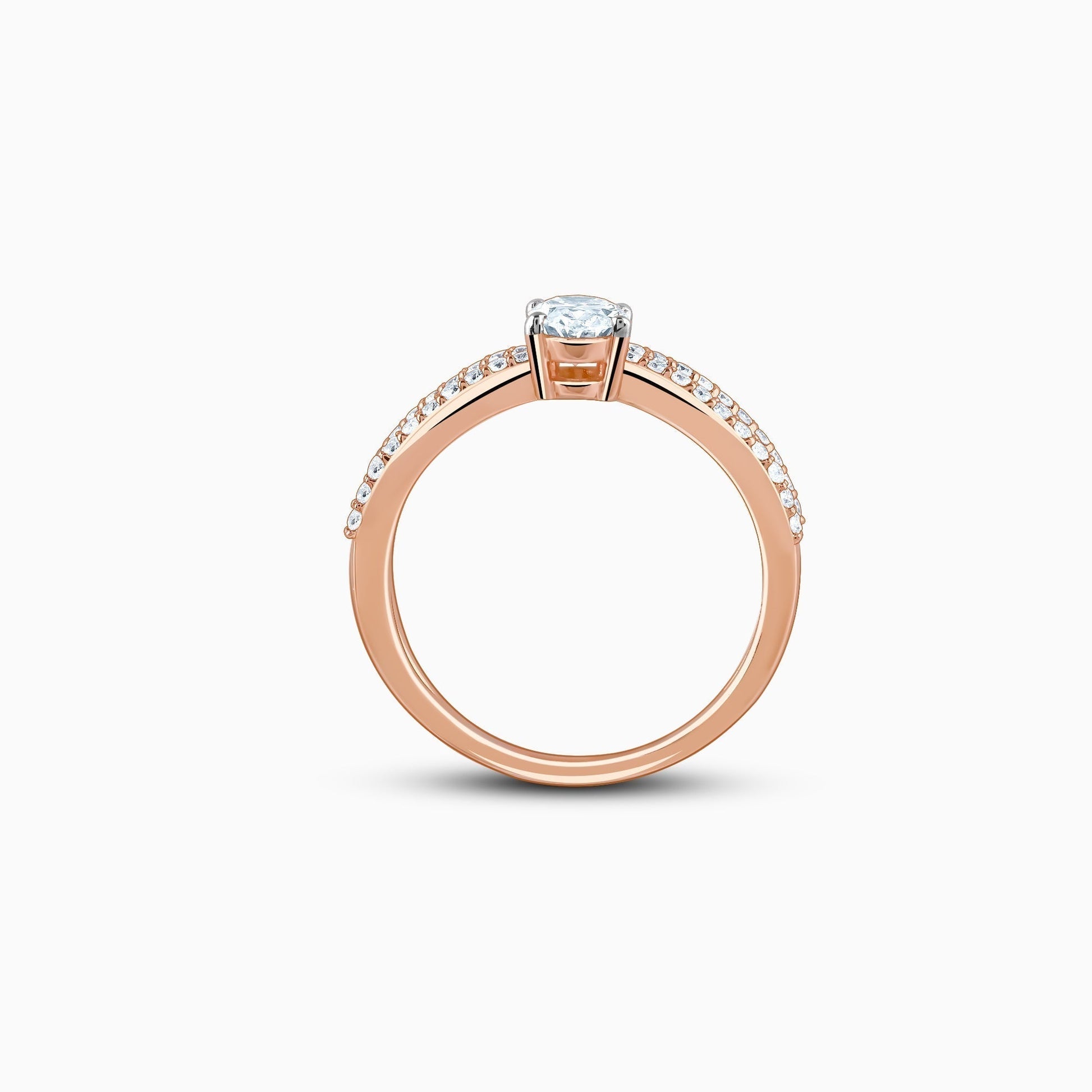 This pure rose gold ring features a dual-band studded with lab-grown diamonds and a larger lab-grown diamond placed at the centre.