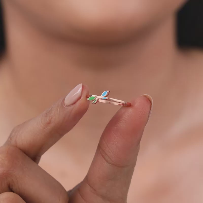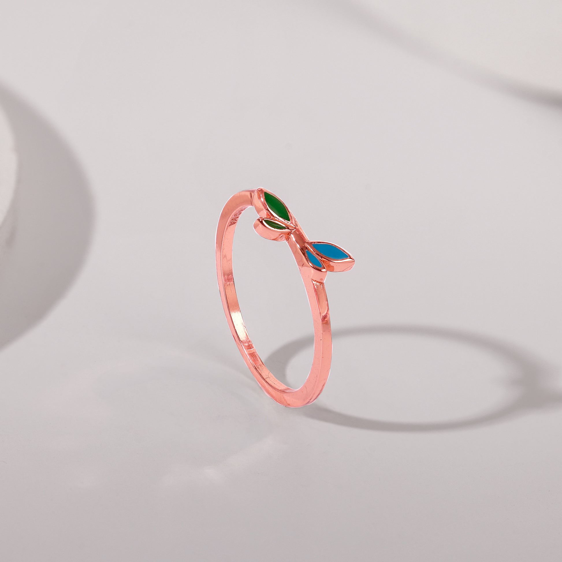 This rose gold ring for women features a stylised leaf design with vibrant enamel detailing sets the top.