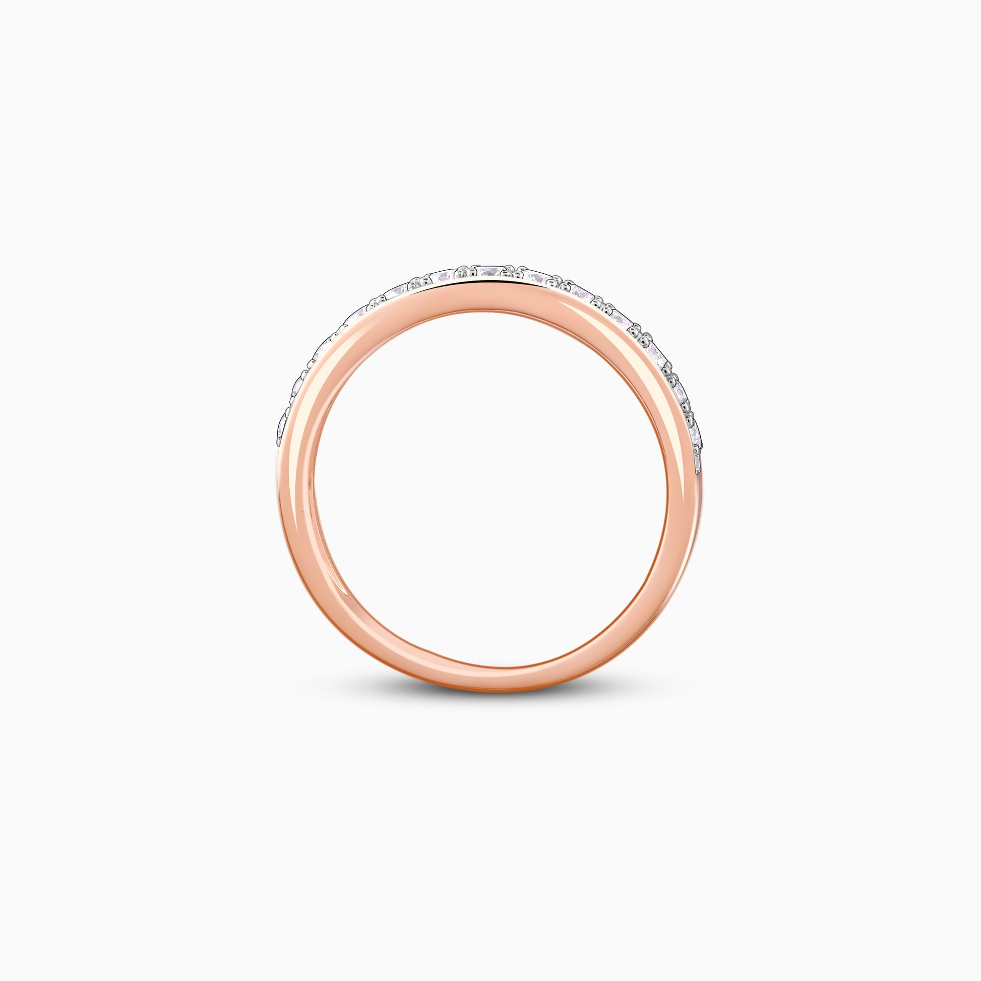 This rose gold ring has lab-grown diamonds studded on its band.
