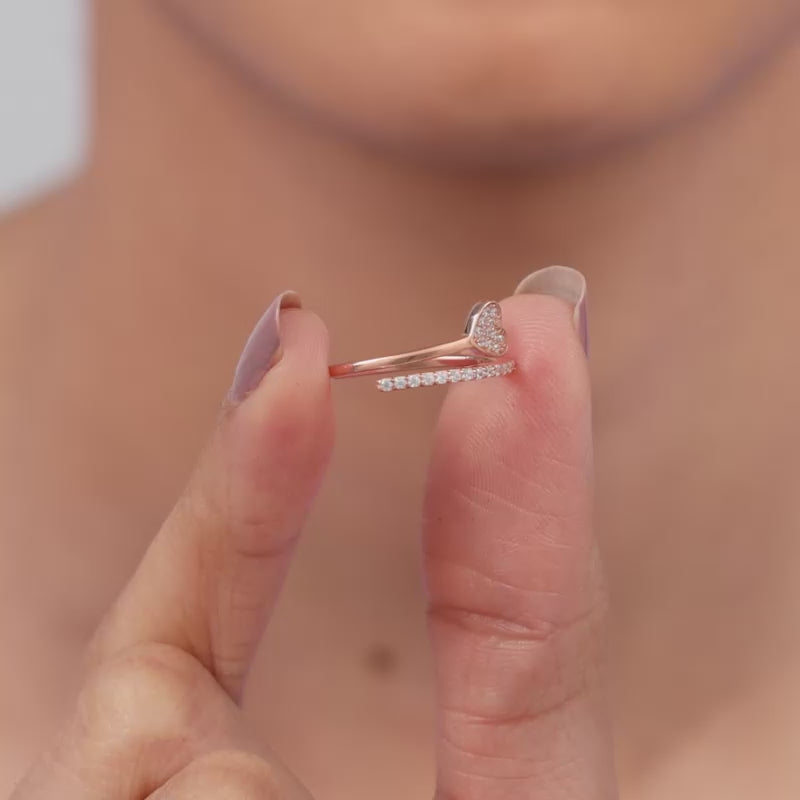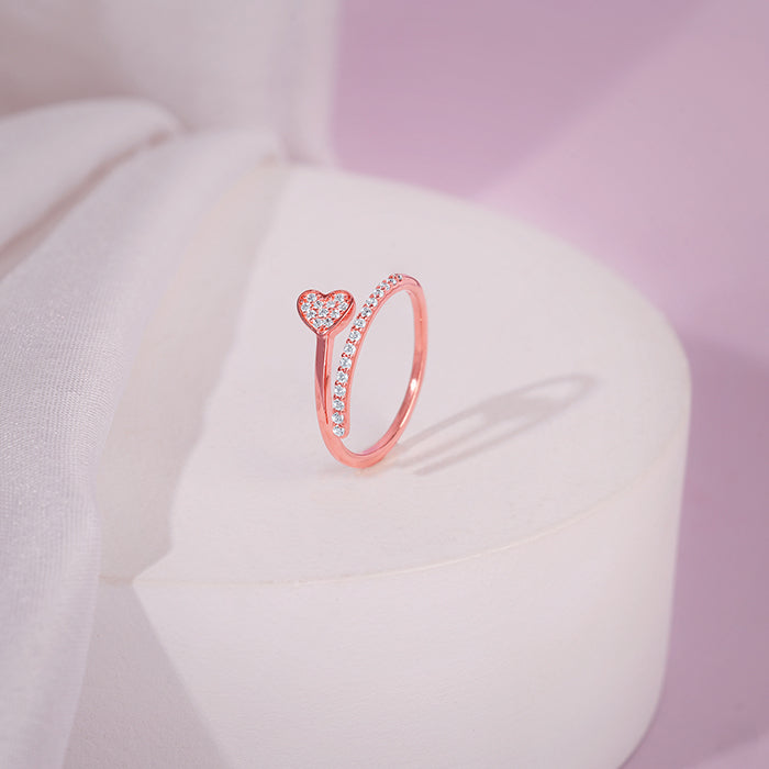 This rose gold plated ring for women features a sparkling heart set with zircons, while the band’s other half is set with a line of zircons, creating a continuous, glittering effect around the finger.