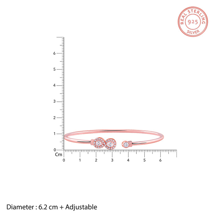 This rose gold plated cuff bracelet for women features an adjustable design with an infinity motif set with zircons. Two pear-shaped stones sit on infinity loops, while a single round zircon accents the other end.
