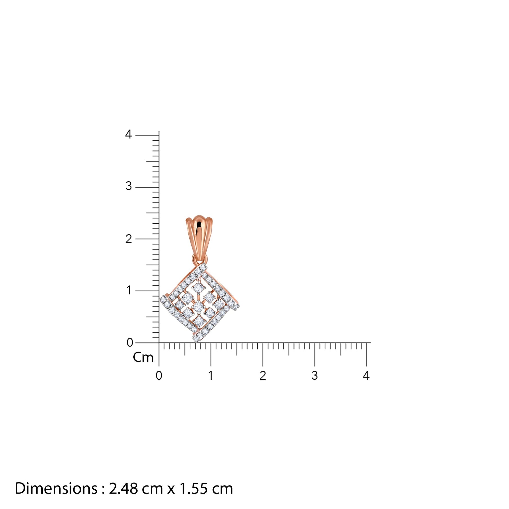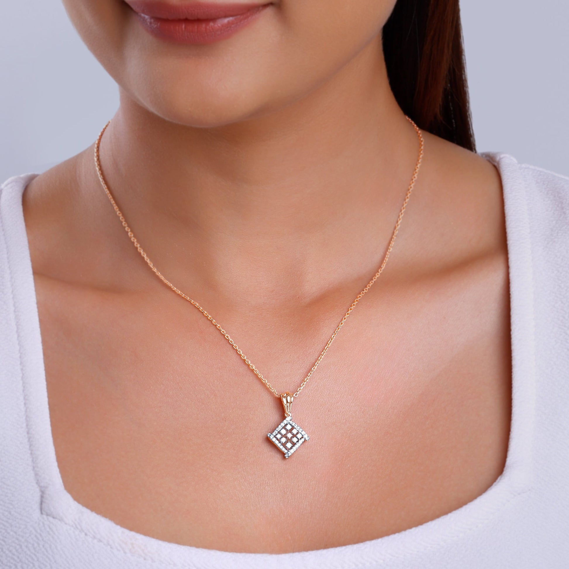 Shaped like a rhombus, this stellar pendant is outlined with diamonds. The square is also dotted with lab-grown diamonds within, giving it a unique appearance.