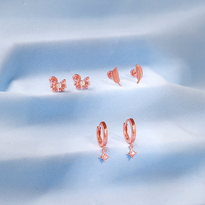 This rose gold plated 3 piercing earrings set brings you three unique styles. It includes hoop designs with zircon star danglers, along with leaf and bow-shaped studs. Got multiple piercings? Get ready to curate your unique ear story! Mix, match, and express your personal style with our latest collection.