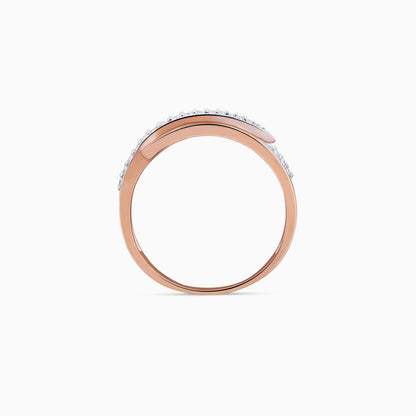 This pure rose gold ring for women features an elegant abstract band diverging into four flowy parallel lines. Two of the lines feature lab grown diamonds in a pave setting.