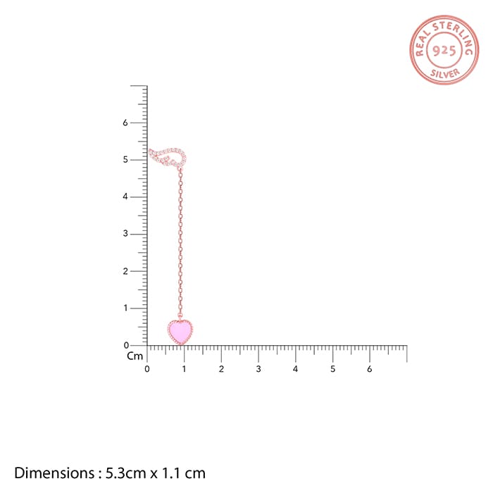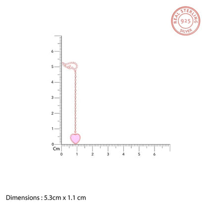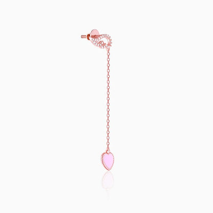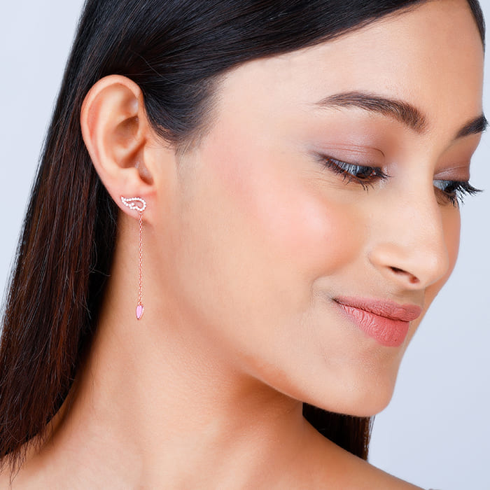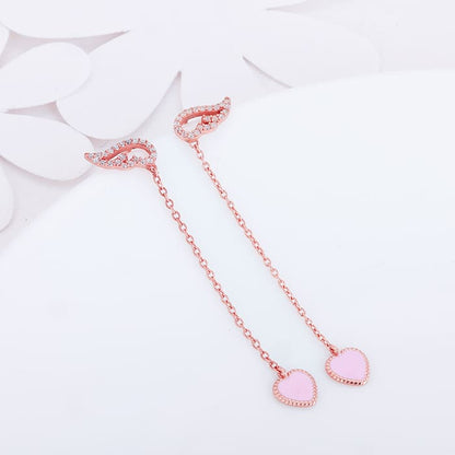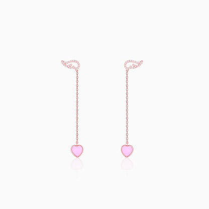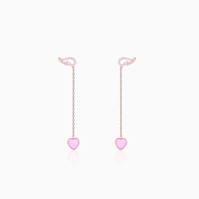 These rose gold dangler earrings have a small wing design holding a cute pink heart with its chain and it is studded with zircons.