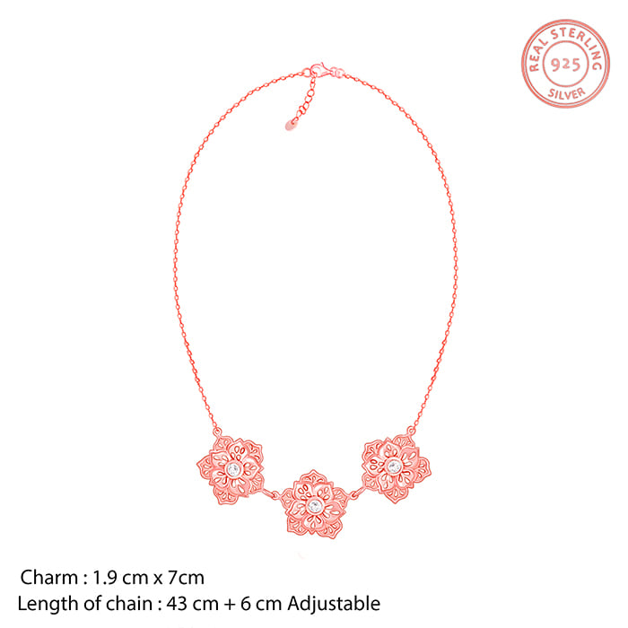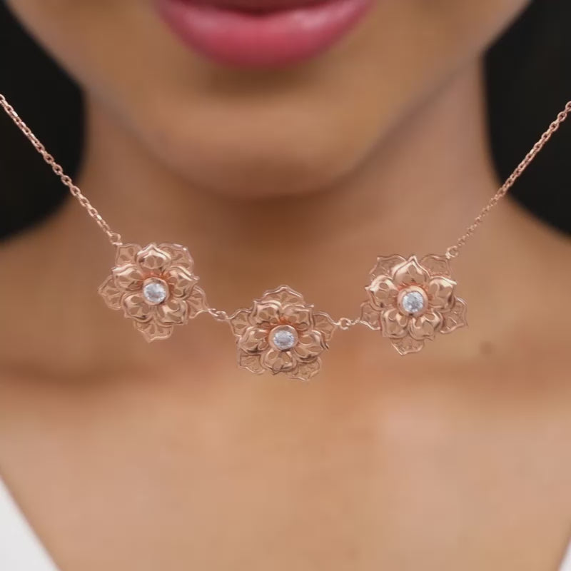 This rose gold necklace features a three filigree floral motifs nestling a zircon in their centres.