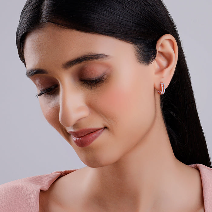 These rose gold plated earrings feature a hoop design. They are flaunted with a double row of sparkling zircons.