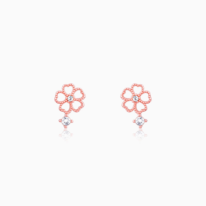 These rose gold earrings feature a flower motif with a zircon set in the centre and a tiny square zircon dangling below.