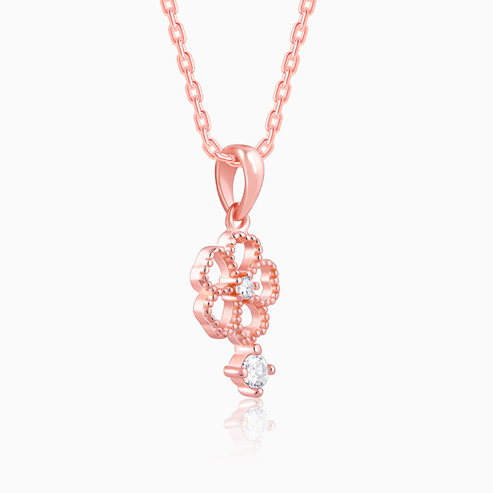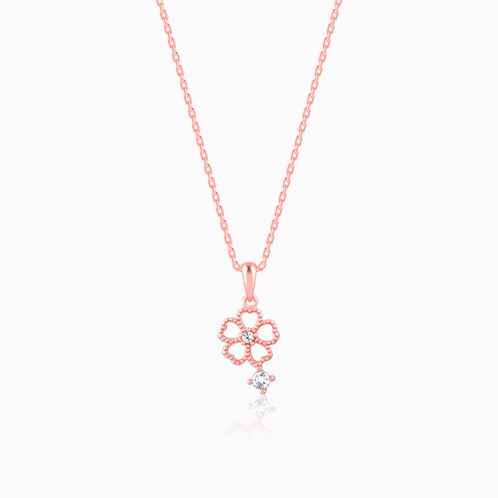 This rose gold pendant with a link chain features a flower motif with a zircon set in the centre and a tiny square zircon dangling below.