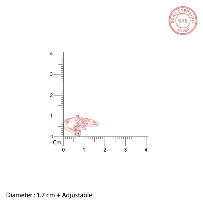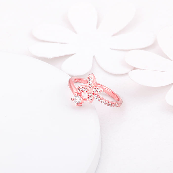 This rose gold ring has an open ring design with four petals floral motif studded with zircons.
