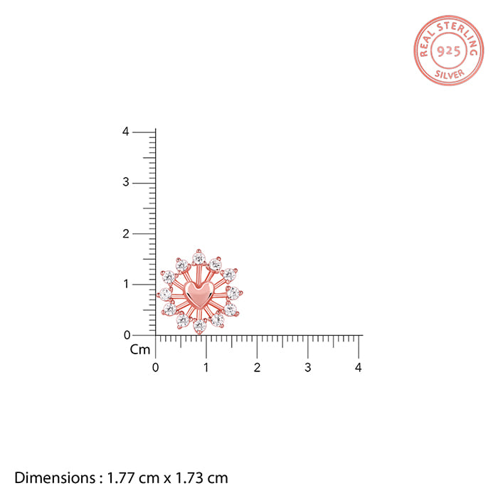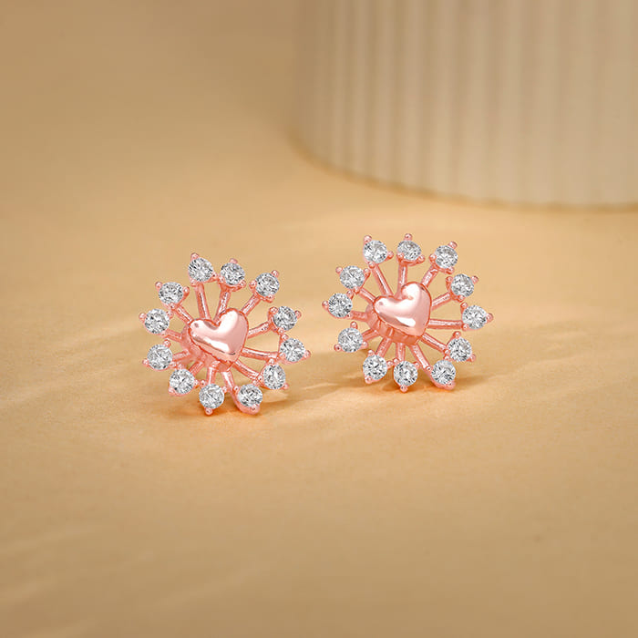 These silver earrings for women feature a coloured heart motif at the centre, surrounded by radiating spokes set with zircons at the tips.