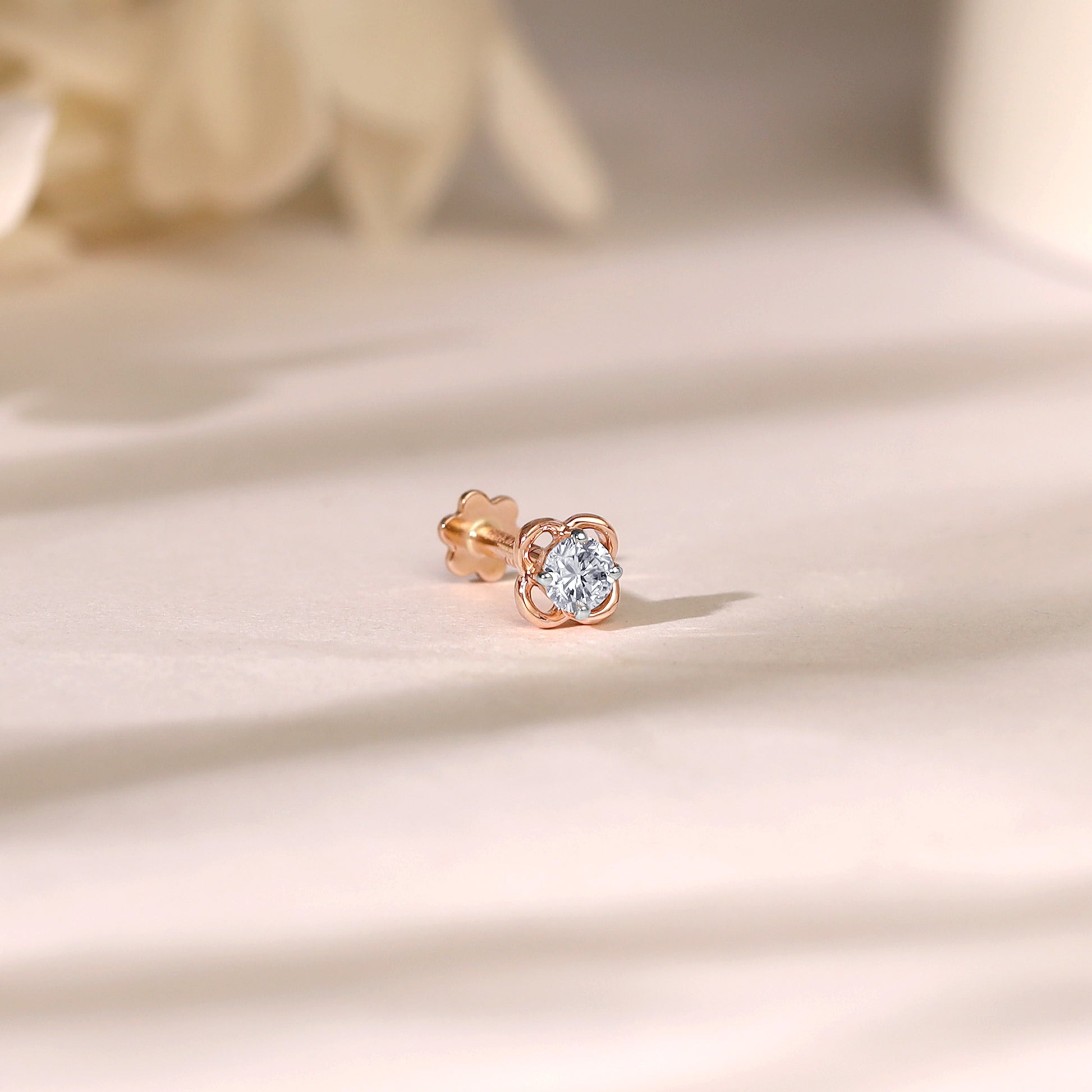 This pure rose gold nose pin for women features a floral motif with a lab grown diamond at the centre.