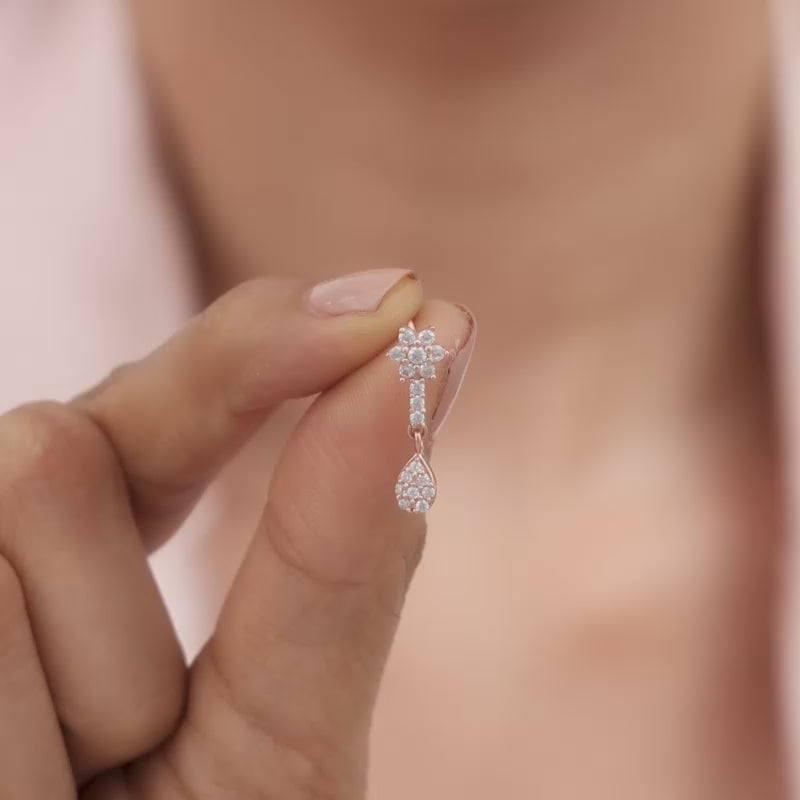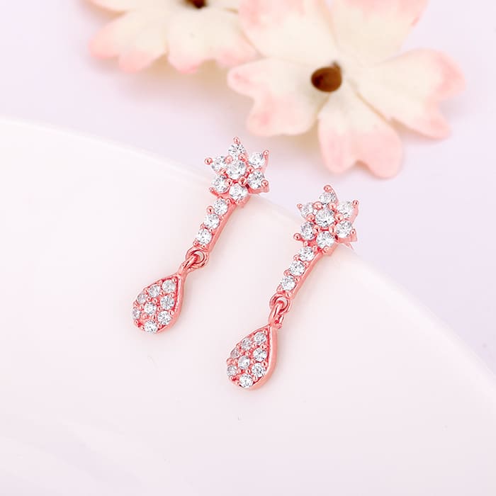 These rose gold earrings with flower studs comes with a dangling design with an oval motif, all studded with zircons.
