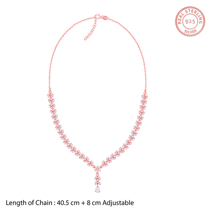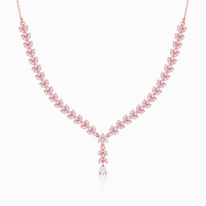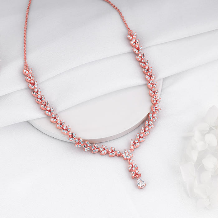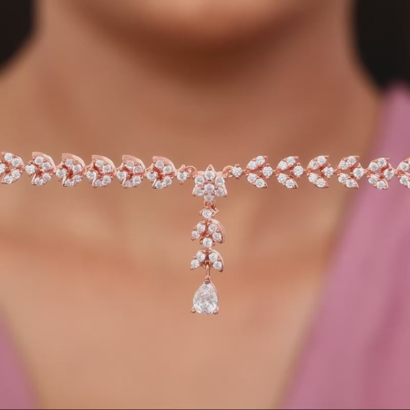 This rose gold necklace has floral motifs with a pear drop dangler in the centre, all studded with zircons.