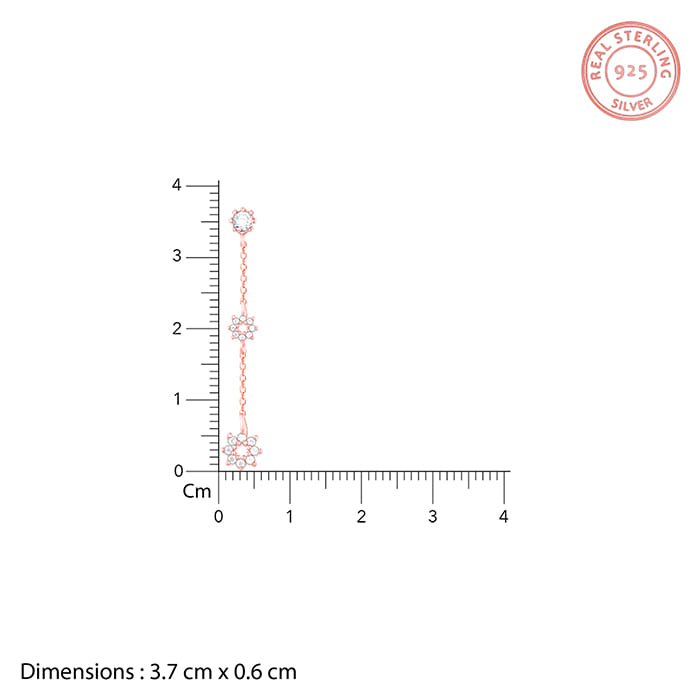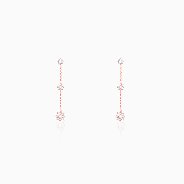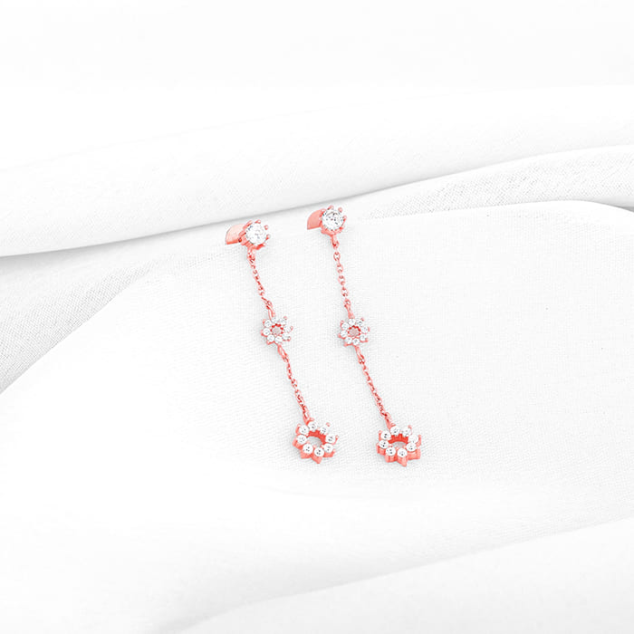 These rose gold earrings have two ring motifs studded with zircons dangling from the zircon studded round motif.