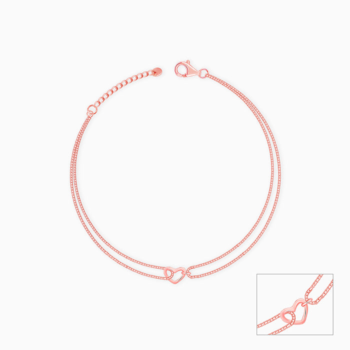 This rose gold anklet has a heart motif suspended in a twin layered chain.