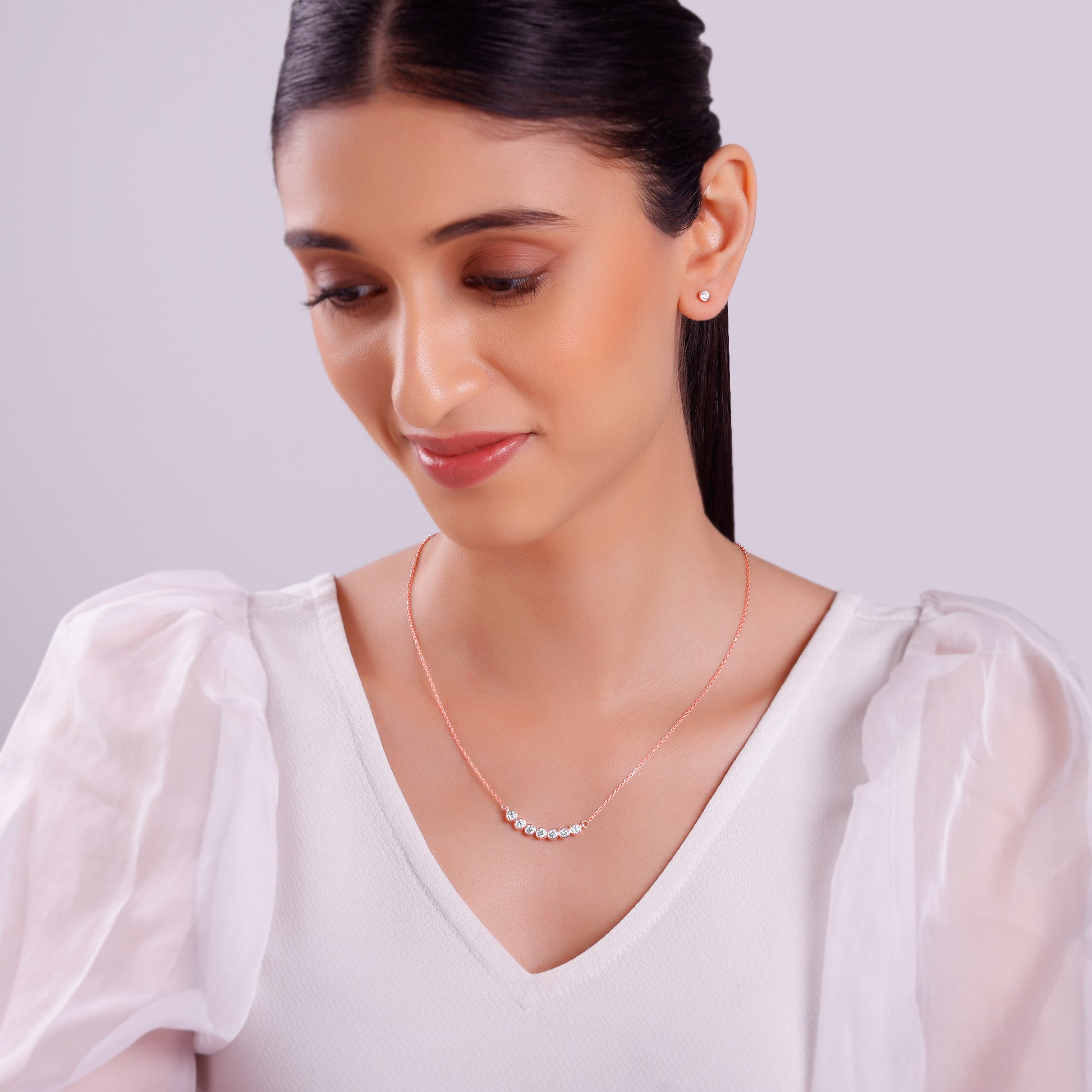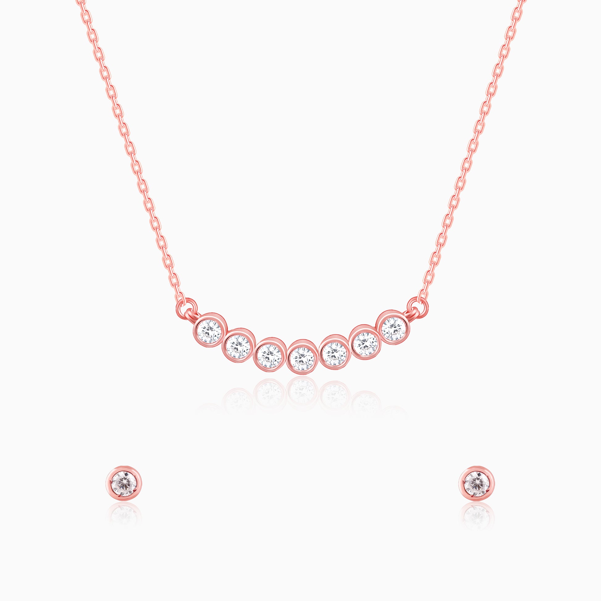 Inspired by the graceful, upward curve of a smile, this set captures simple joy and positive elegance. This set for women features a necklace and earrings. The necklace features a series of circular motifs with bezel-set zircons, while the matching earrings showcase a single bezel-set zircon.