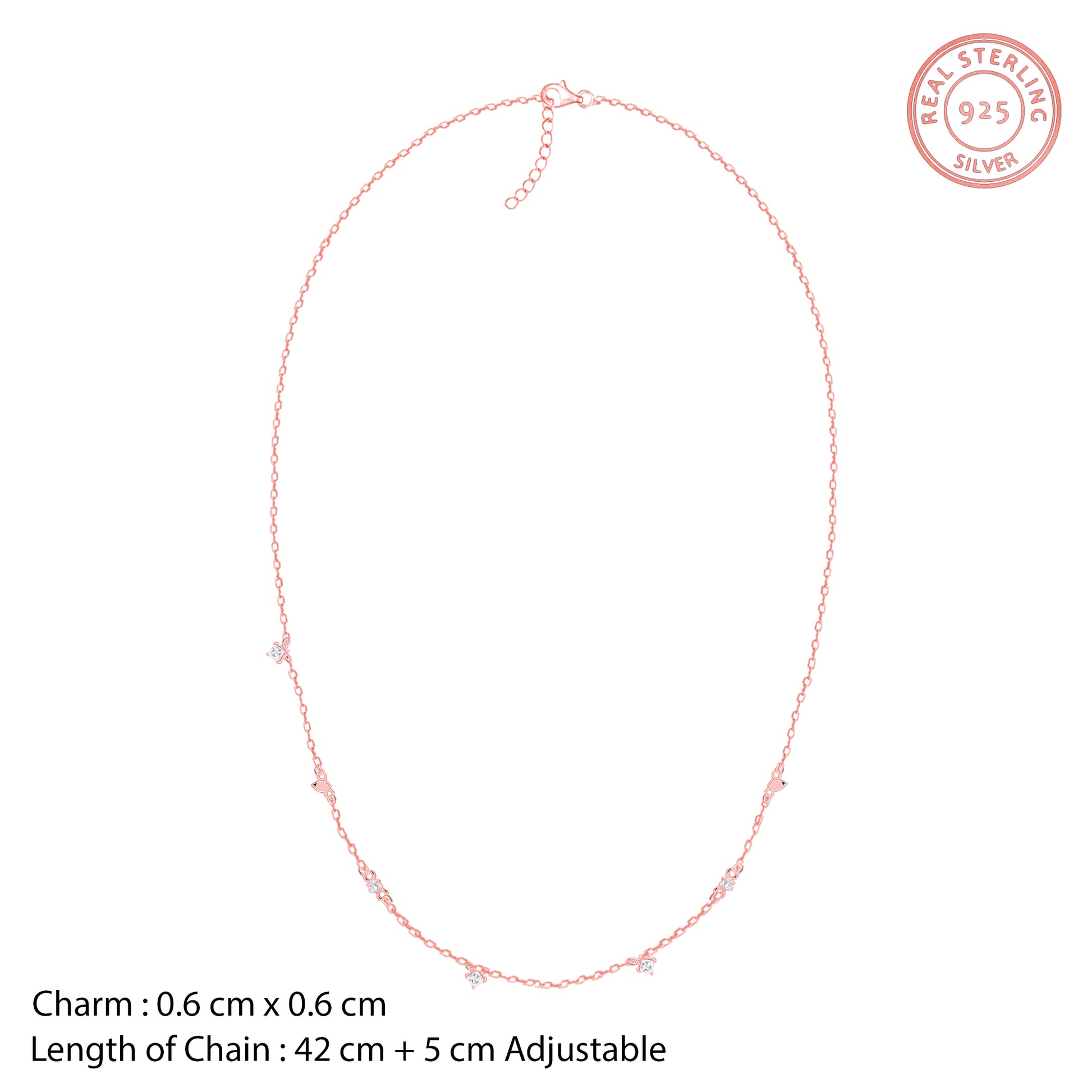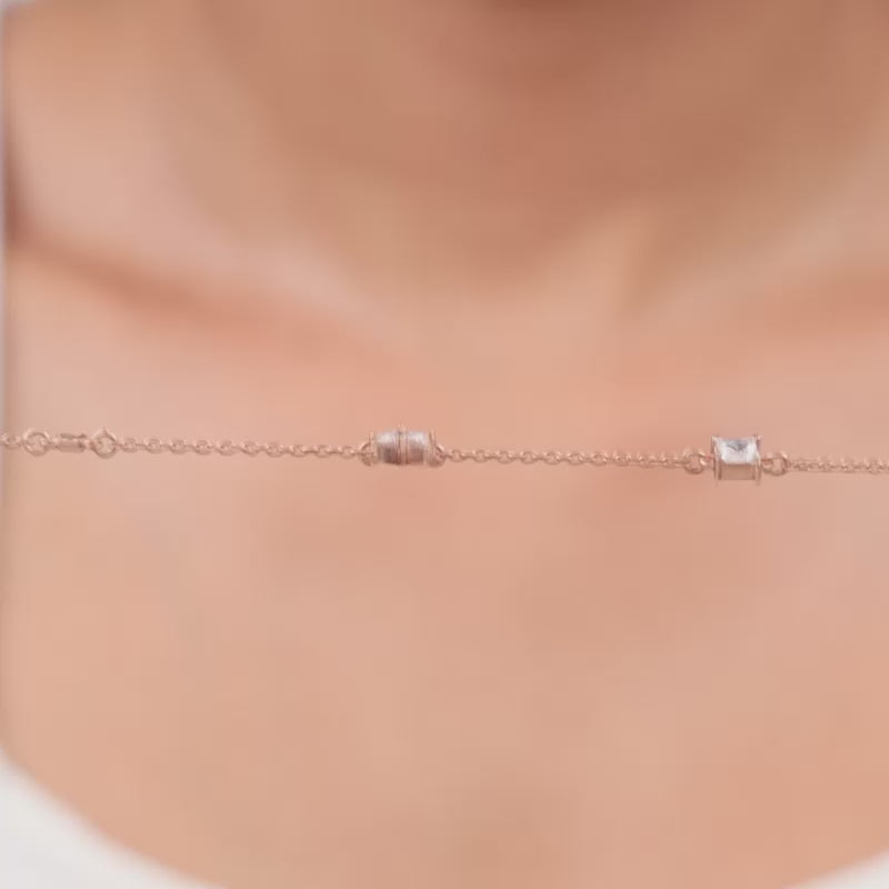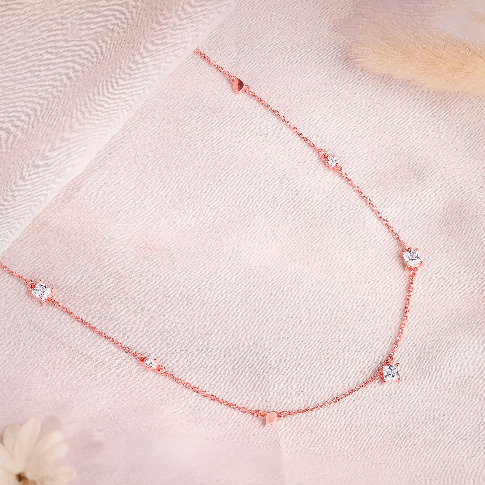 This necklace captures effortless beauty, offering a continuous, understated sparkle that elevates everyday style. this rose gold plated chain is set with an array of zircons in various bezel settings and cuts, creating a stunning line of light along your collarbone.