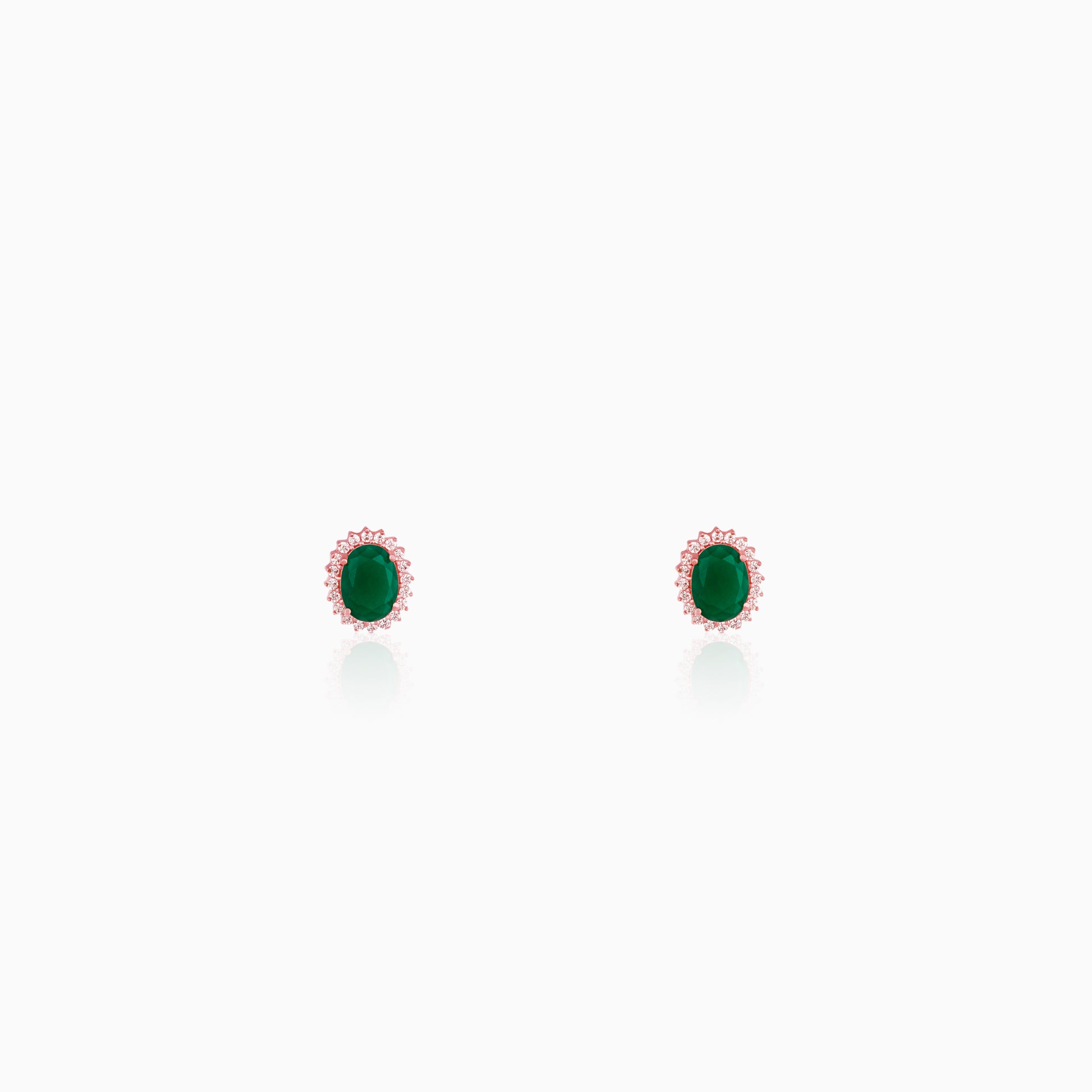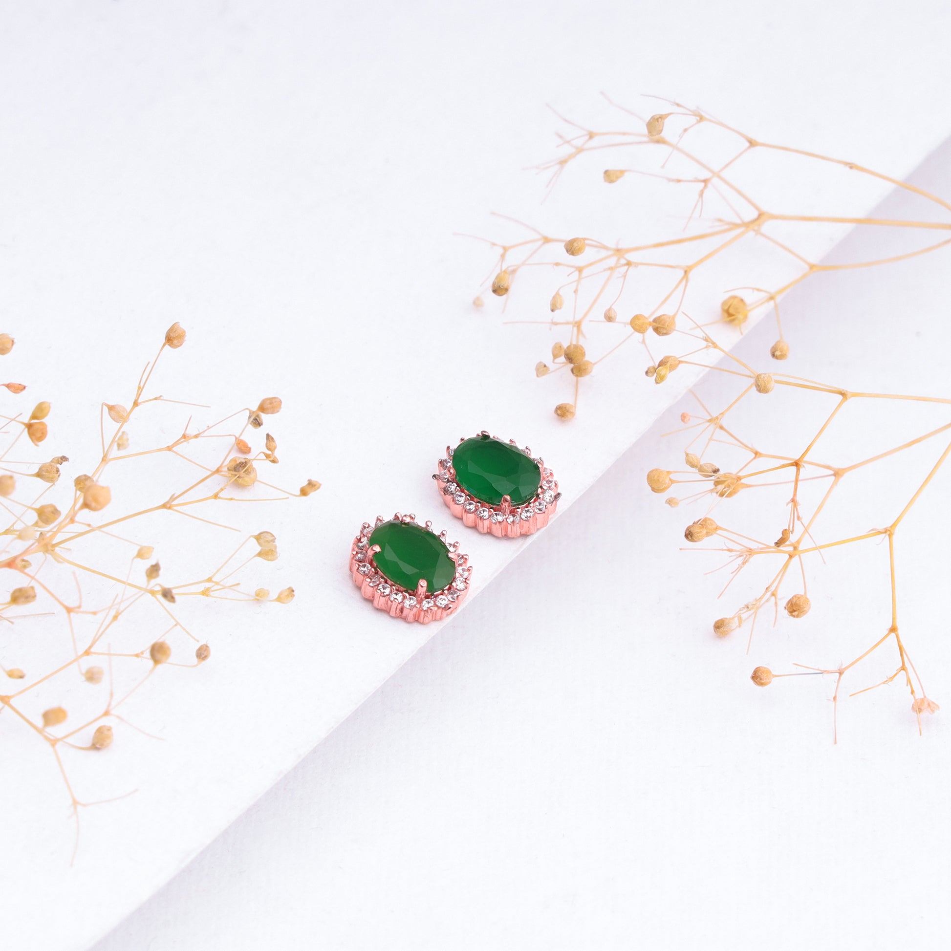 The Rose Gold Evergreen Halo Studs have a green coloured gemstone encircled by zircons.