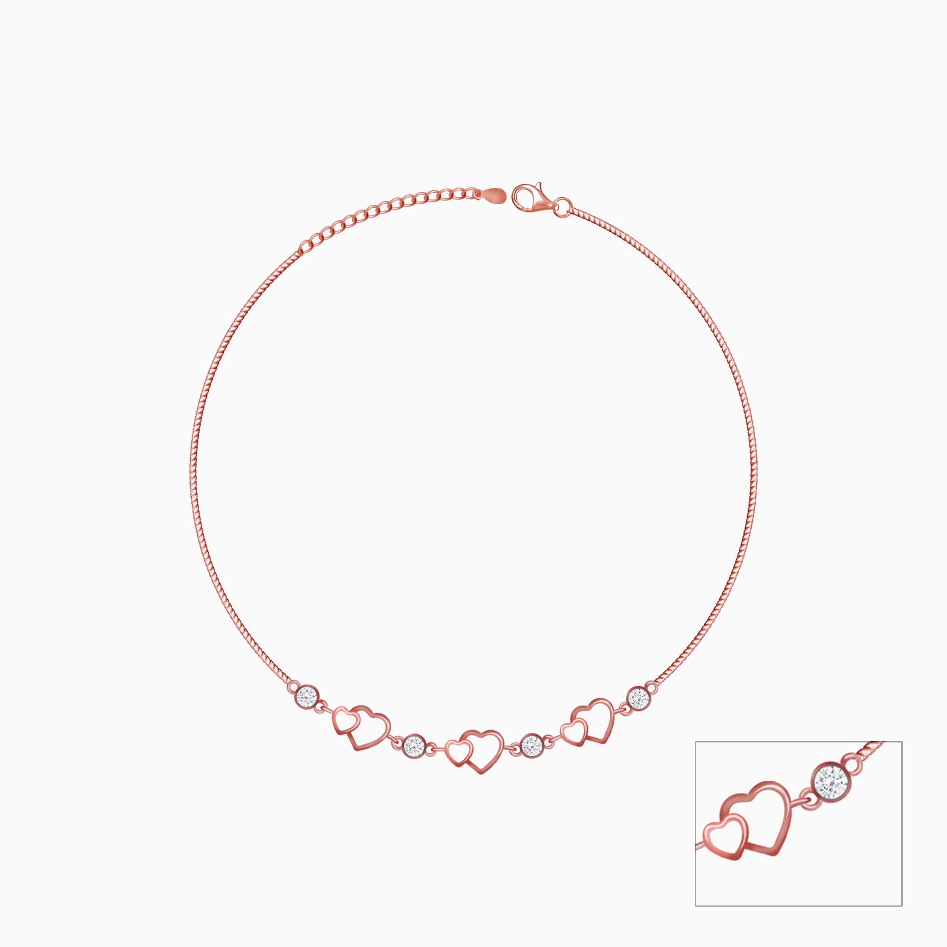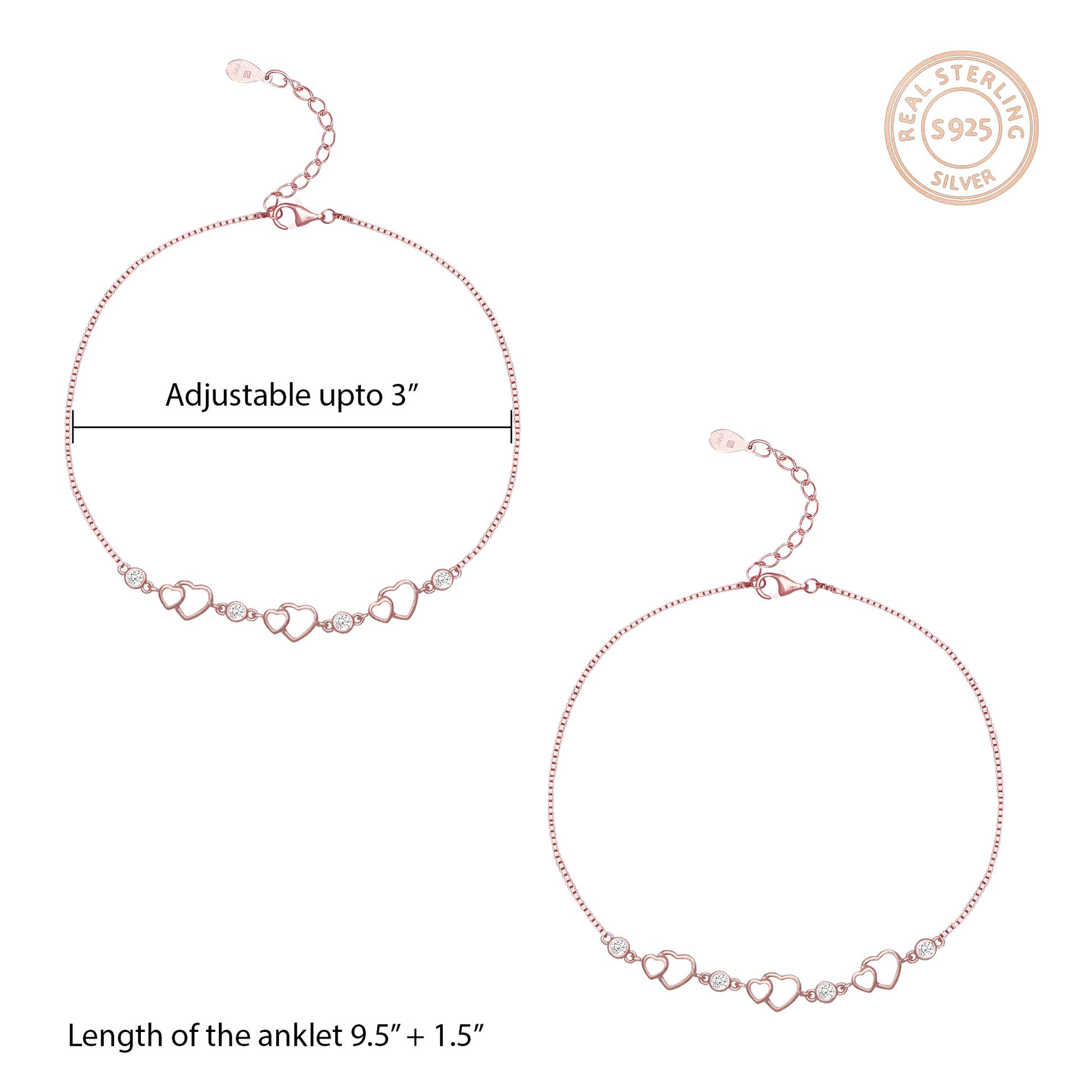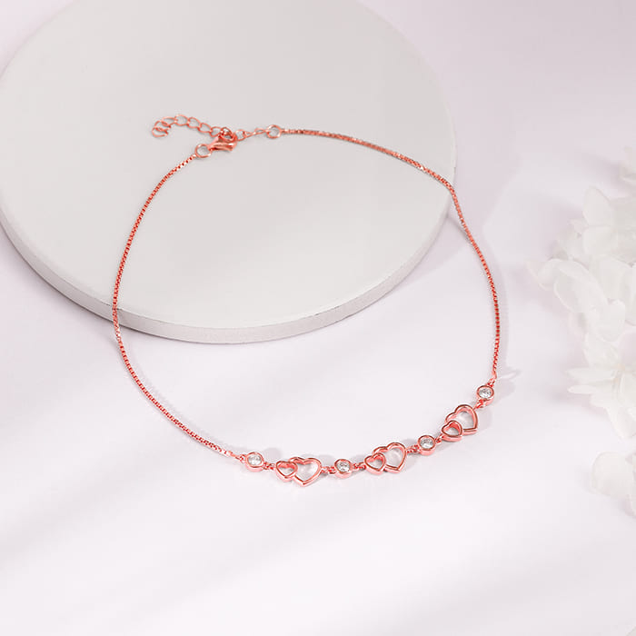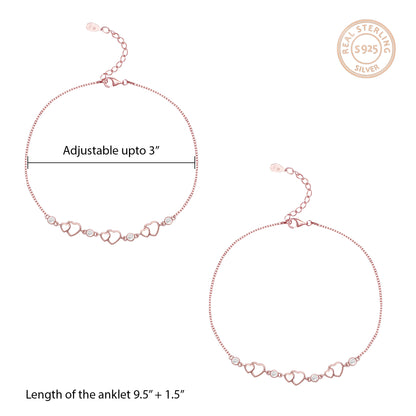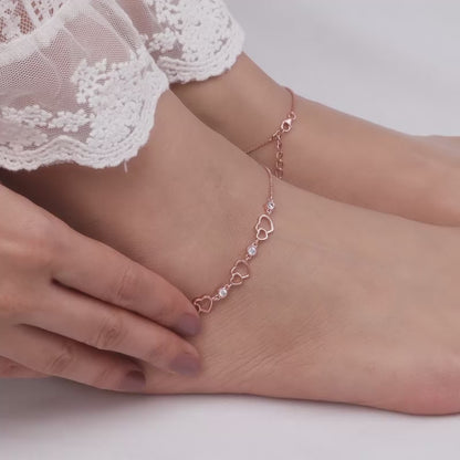 This Rose Gold Heart Anklet has been handcrafted with love, especially for YOU! A trio of adorable hearts and sparkling zircons make this anklet truly adorable.