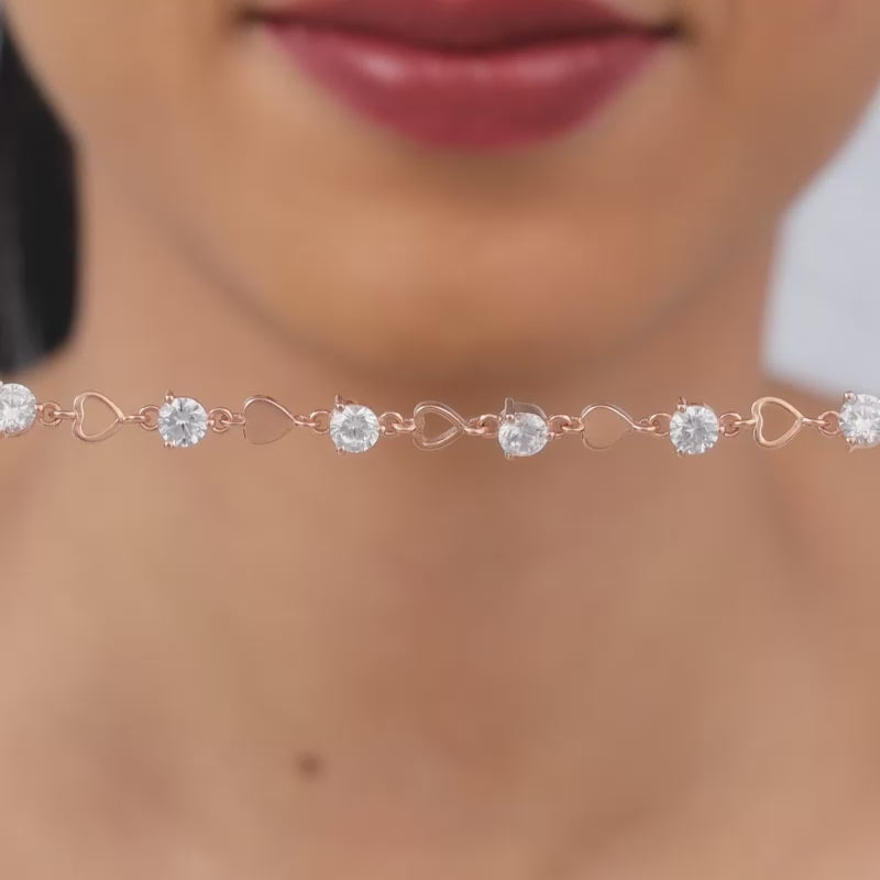 This rose gold-plated bracelet features heart-shaped motifs and zircons.