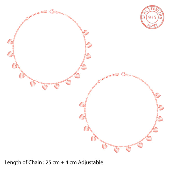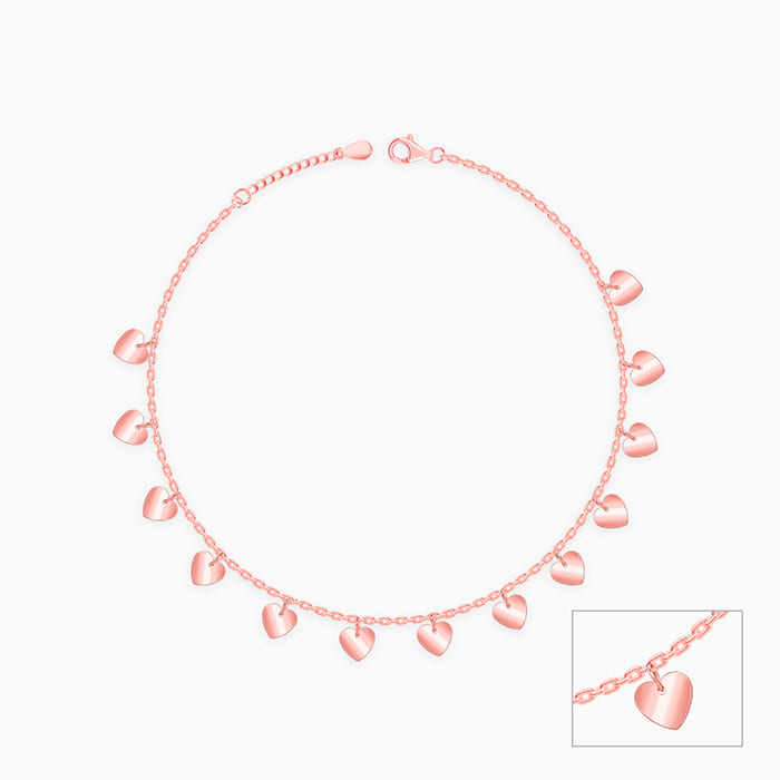 This rose gold plated anklet for women showcases dangling hearts all along the chain.