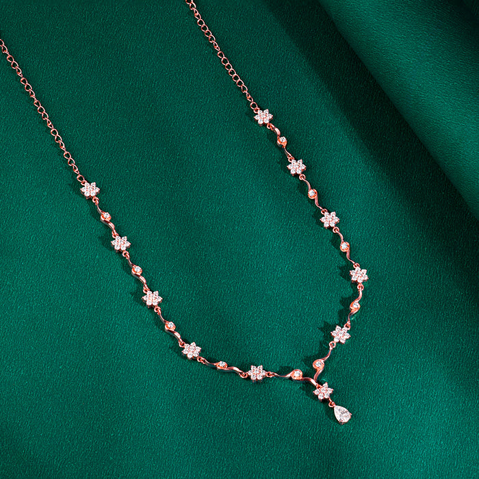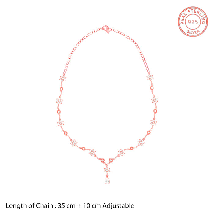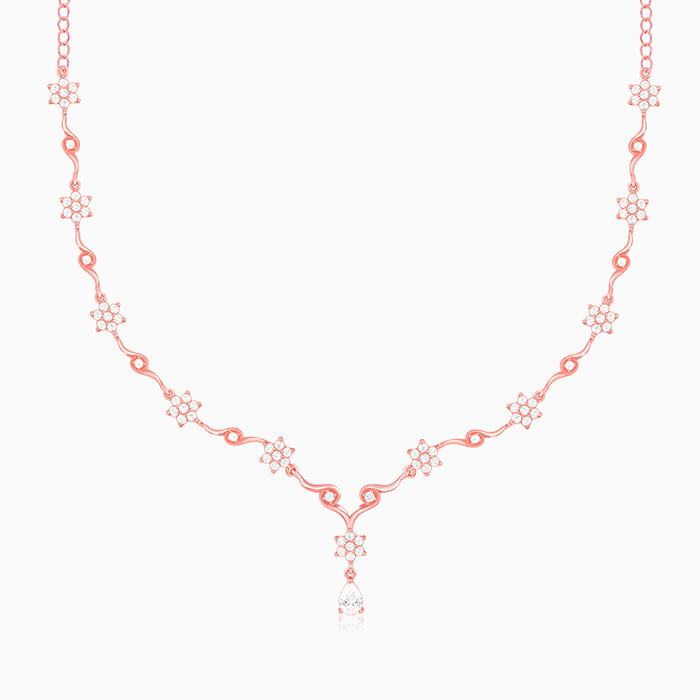 This rose gold necklace for women features a symmetrical arrangement of floral motifs, each set with sparkling zircons, connected by a slender chain. A single, larger teardrop motif hangs from the centre, enhancing its elegant and refined aesthetic. Presenting our DIVA Collection - a limited edition silver jewellery meant for the women who own every room. Be the star of the party, always.