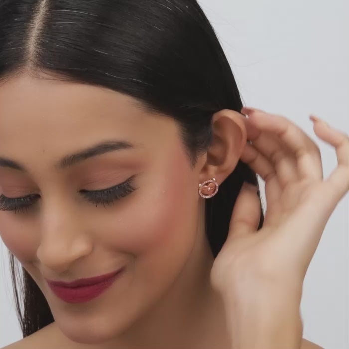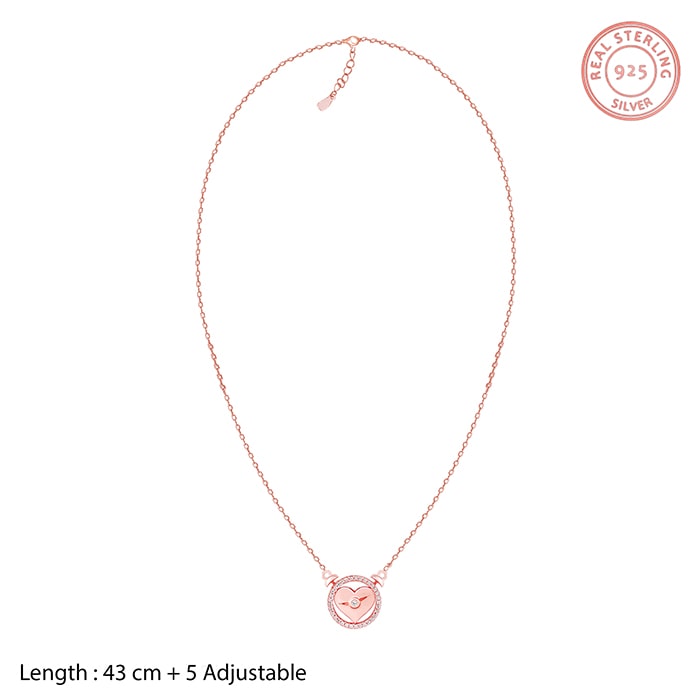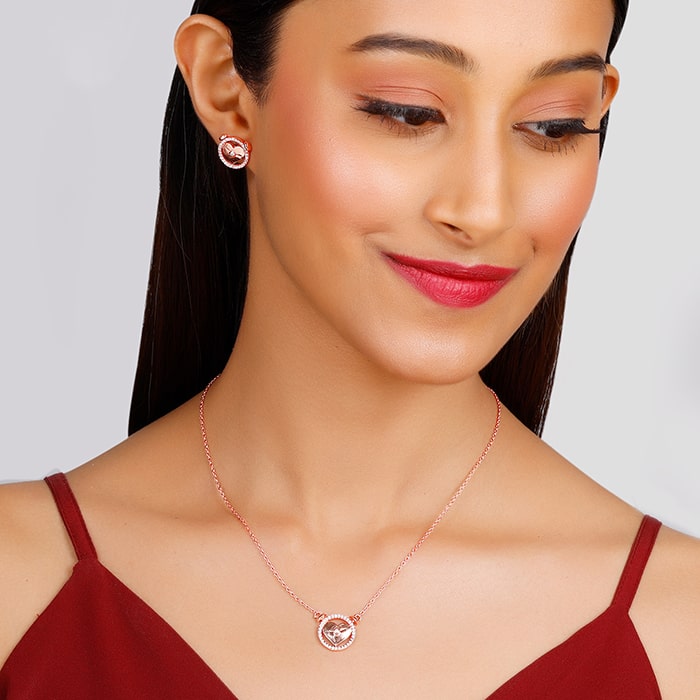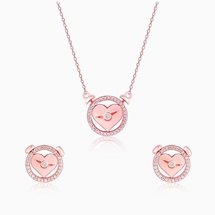 The Rose Gold set includes a necklace and a pair of studs with a zircon-studded circular motif with a heart in it.