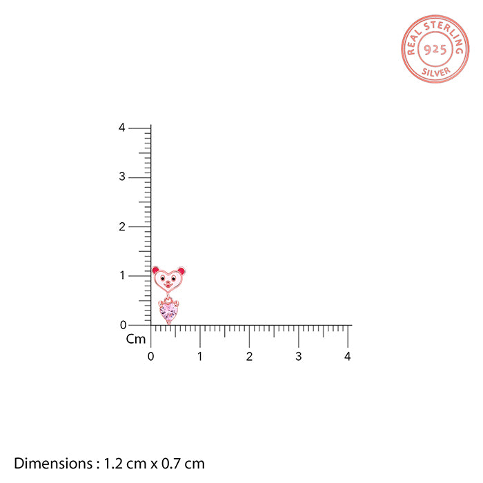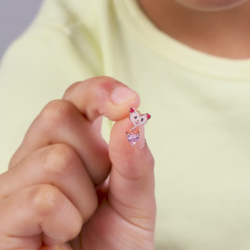 These rose gold kids earrings feature a GIVA mascot motif accented with enamel. A heart-shaped coloured stone dangles below.