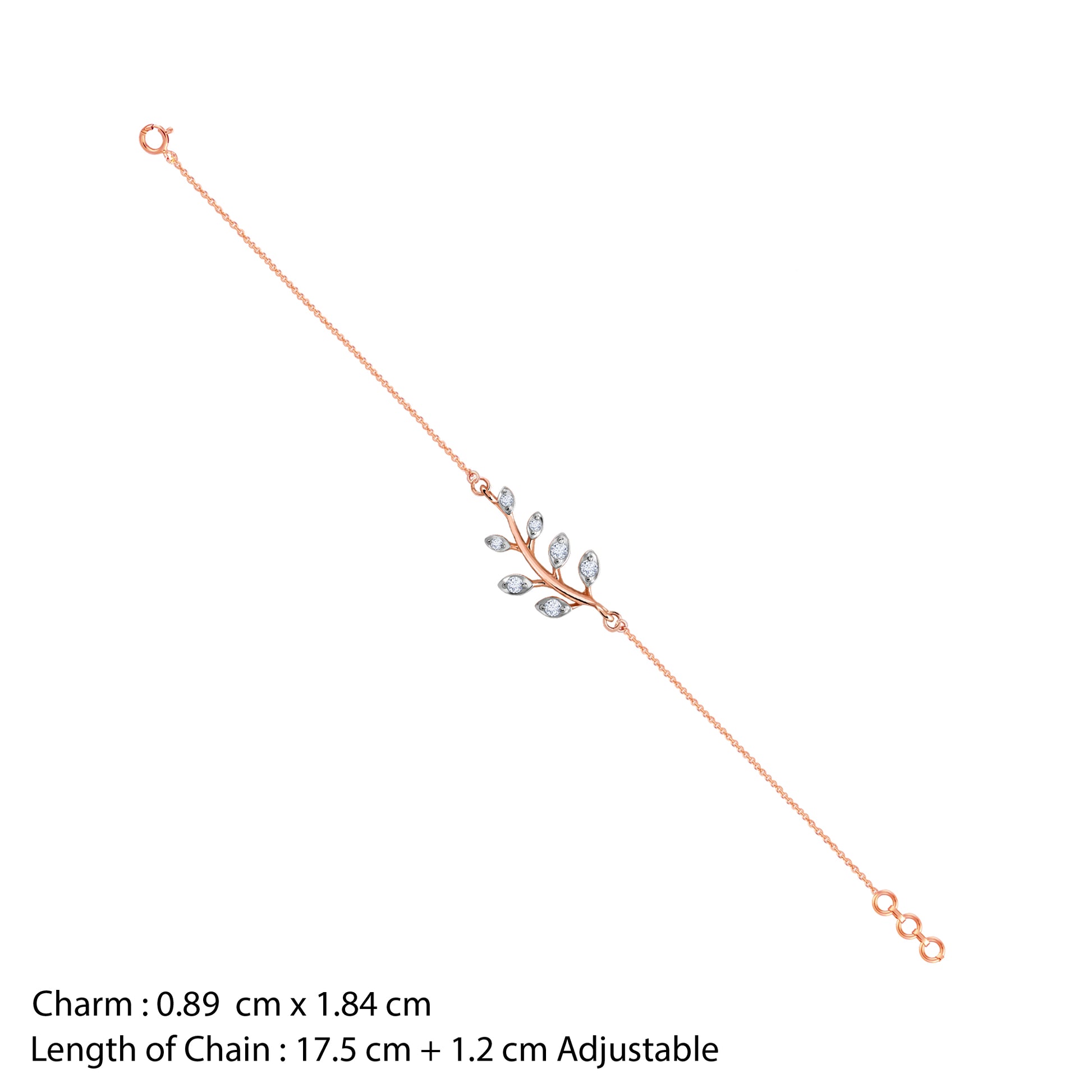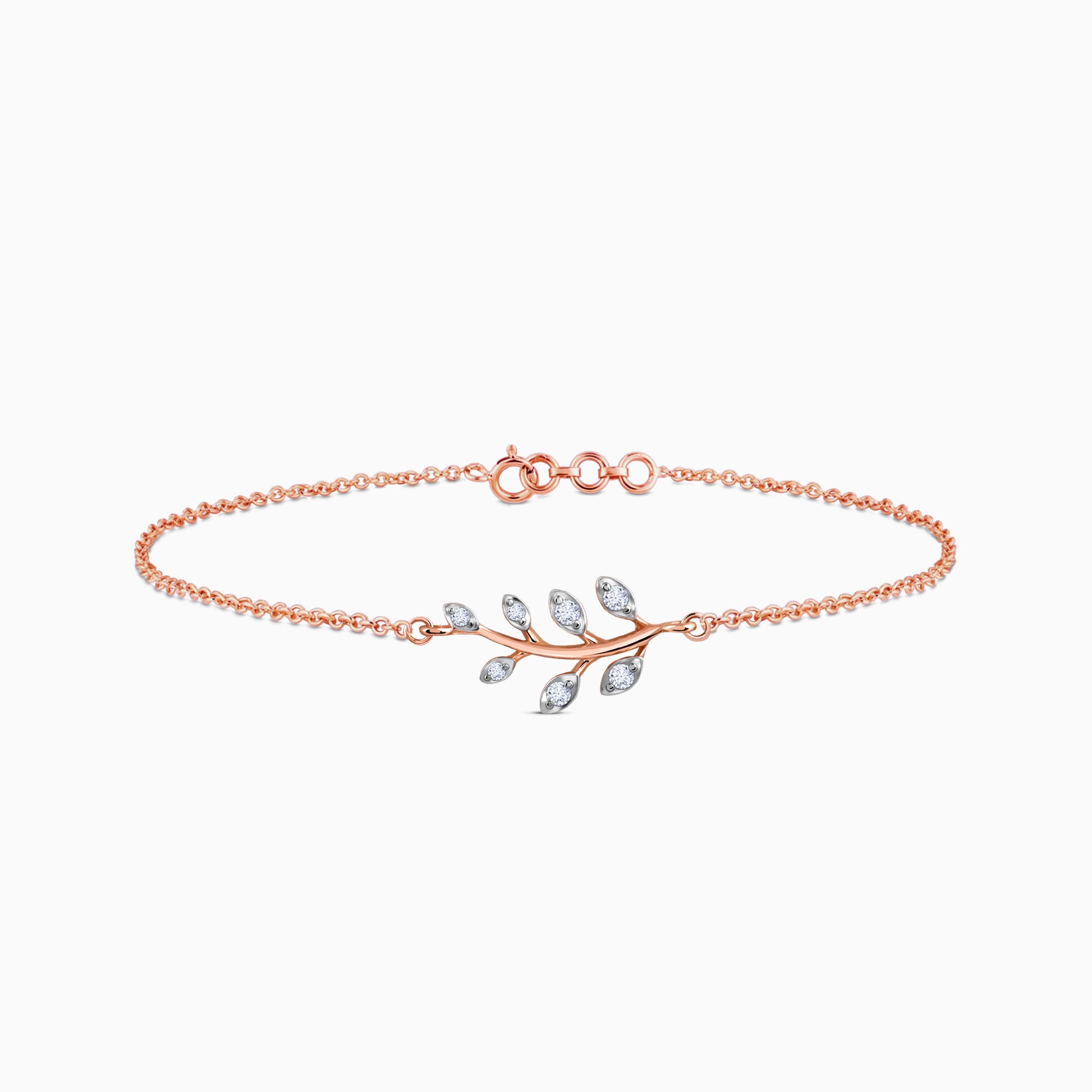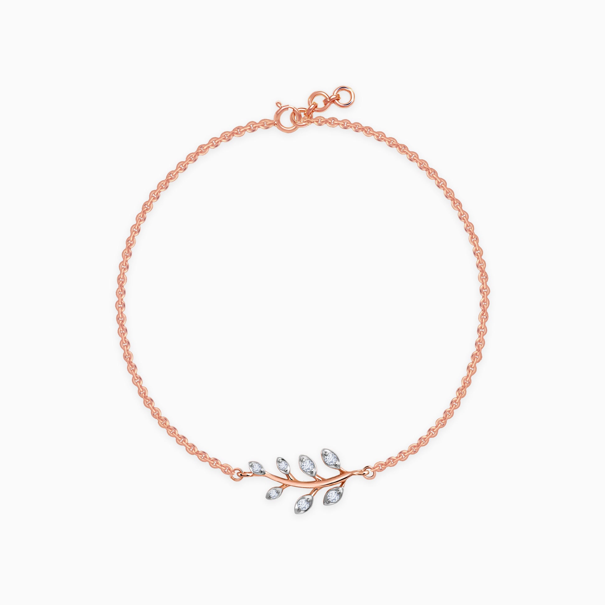 This pure rose gold bracelet for women features a leaf branch as a centrepiece, studded with lab grown diamonds.